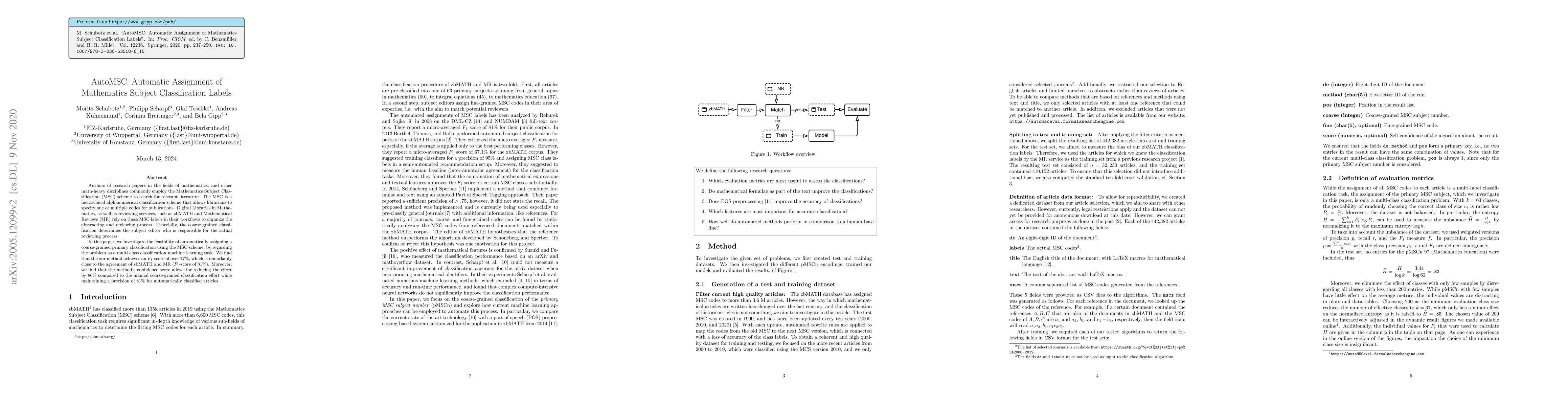 Authors of research papers in the fields of mathematics, and other math-heavy disciplines commonly employ the Mathematics Subject Classification (MSC) scheme to search for relevant literature. The MSC is a hierarchical alphanumerical classification scheme that allows librarians to specify one or multiple codes for publications. Digital Libraries in Mathematics, as well as reviewing services, such as zbMATH and Mathematical Reviews (MR) rely on these MSC labels in their workflows to organize the abstracting and reviewing process. Especially, the coarse-grained classification determines the subject editor who is responsible for the actual reviewing process. In this paper, we investigate the feasibility of automatically assigning a coarse-grained primary classification using the MSC scheme, by regarding the problem as a multi-class classification machine learning task. We find that our method achieves an (F_1)-score of over 77%, which is remarkably close to the agreement of zbMATH and MR ((F_1)-score of 81%). Moreover, we find that the method's confidence score allows for reducing the effort by 86% compared to the manual coarse-grained classification effort while maintaining a precision of 81% for automatically classified articles.