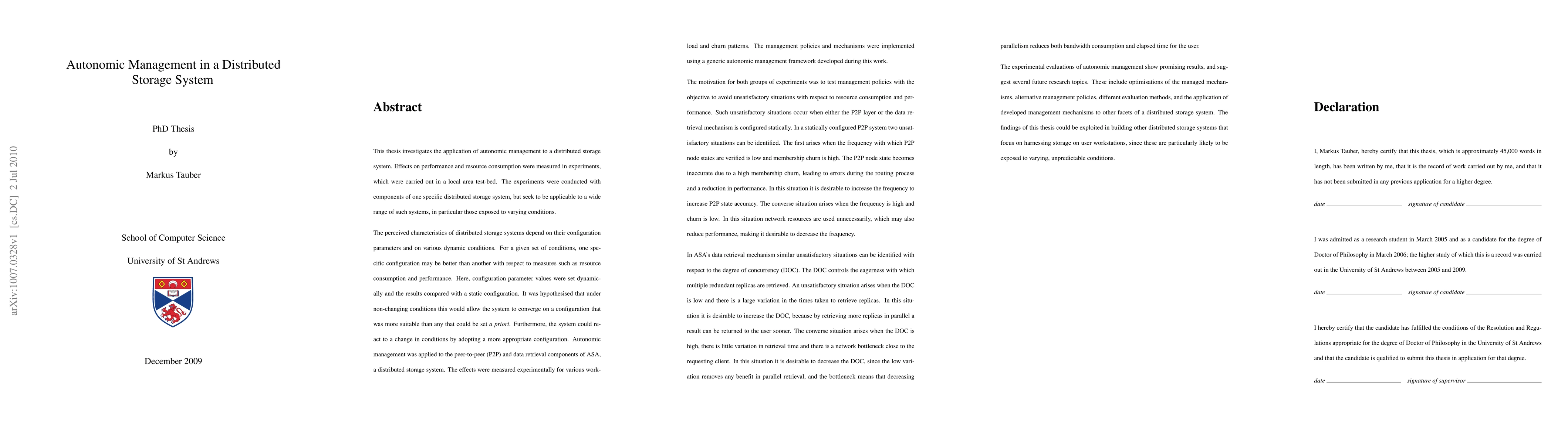 This research explores autonomic management in distributed storage systems, demonstrating its potential to dynamically adjust configuration parameters to optimize performance and resource consumption under varying conditions. Experimental results indicate that autonomic management can outperform static configurations, especially in environments with unpredictable workloads.