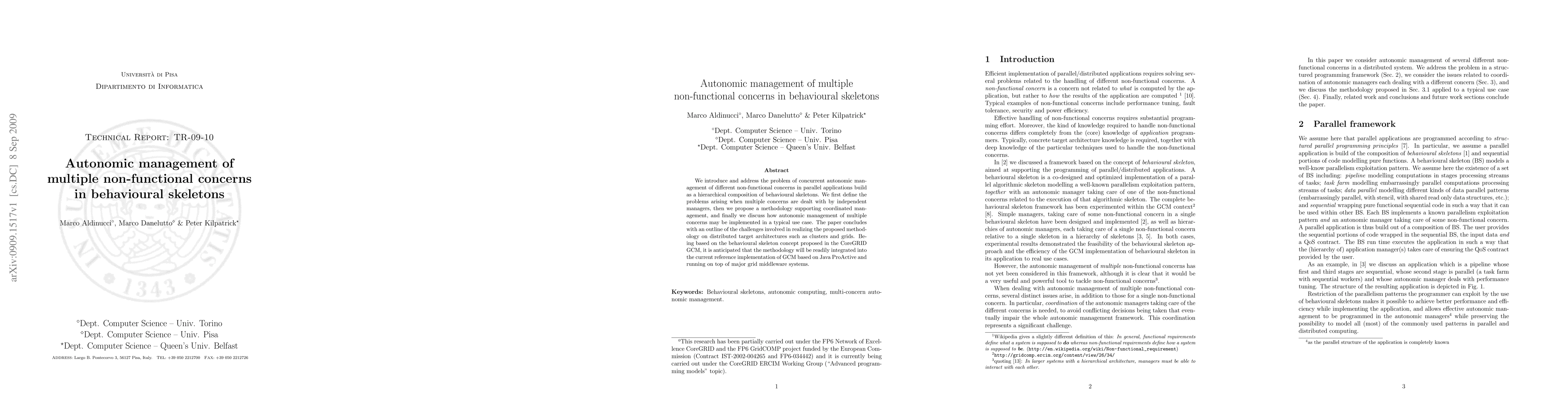 We introduce and address the problem of concurrent autonomic management of different non-functional concerns in parallel applications build as a hierarchical composition of behavioural skeletons. We first define the problems arising when multiple concerns are dealt with by independent managers, then we propose a methodology supporting coordinated management, and finally we discuss how autonomic management of multiple concerns may be implemented in a typical use case. The paper concludes with an outline of the challenges involved in realizing the proposed methodology on distributed target architectures such as clusters and grids. Being based on the behavioural skeleton concept proposed in the CoreGRID GCM, it is anticipated that the methodology will be readily integrated into the current reference implementation of GCM based on Java ProActive and running on top of major grid middleware systems.