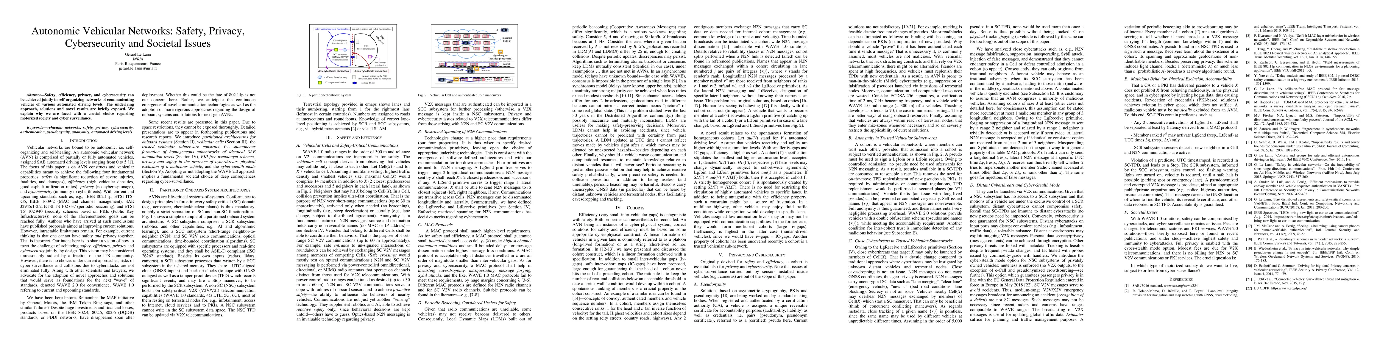 The paper discusses the simultaneous achievement of safety, efficiency, privacy, and cybersecurity in autonomous vehicle networks. It highlights the critical decision point in motorized society concerning cyber surveillance, presenting underlying approaches and novel results without delving into technical specifics.