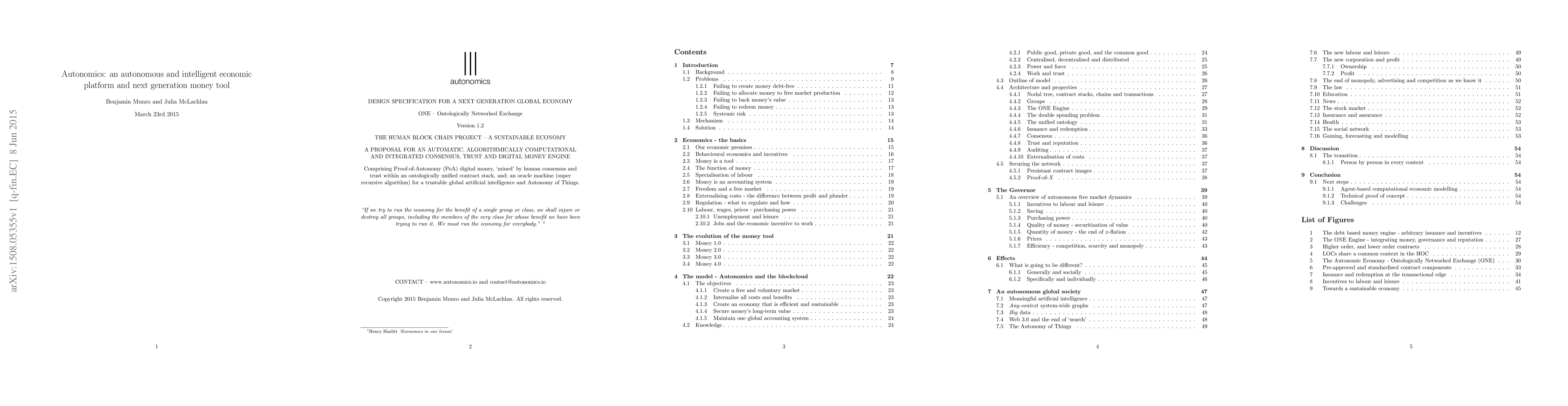 We propose a high level network architecture for an economic system that integrates money, governance and reputation. We introduce a method for issuing, and redeeming a digital coin using a mechanism to create a sustainable global economy and a free market. To maintain a currency's value over time, and therefore be money proper, we claim it must be issued by the buyer and backed for value by the seller, exchanging the products of labour, in a free market. We also claim that a free market and sustainable economy cannot be maintained using economically arbitrary creation and allocation of money. Nakamoto, with Bitcoin, introduced a new technology called the cryptographic blockchain to operate a decentralised and distributed accounts ledger without the need for an untrusted third party. This blockchain technology creates and allocates new digital currency as a reward for "proof-of-work", to secure the network. However, no currency, digital or otherwise, has solved how to create and allocate money in an economically non-arbitrary way, or how to govern and trust a world-scale free enterprise money system. We propose an "Ontologically Networked Exchange" (ONE), with purpose as its highest order domain. Each purpose is defined in a contract, and the entire economy of contracts is structured in a unified ontology. We claim to secure the ONE network using economically non-arbitrary methodologies and economically incented human behaviour. Decisions influenced by reputation help to secure the network without an untrusted third party. The stack of contracts, organised in a unified ontology, functions as a super recursive algorithm, with individual use programming the algorithm, acting as the "oracle". The state of the algorithm becomes the "memory" of a scalable and trustable artificial intelligence (AI). This AI offers a new platform for what we call the "Autonomy-of-Things" (AoT).