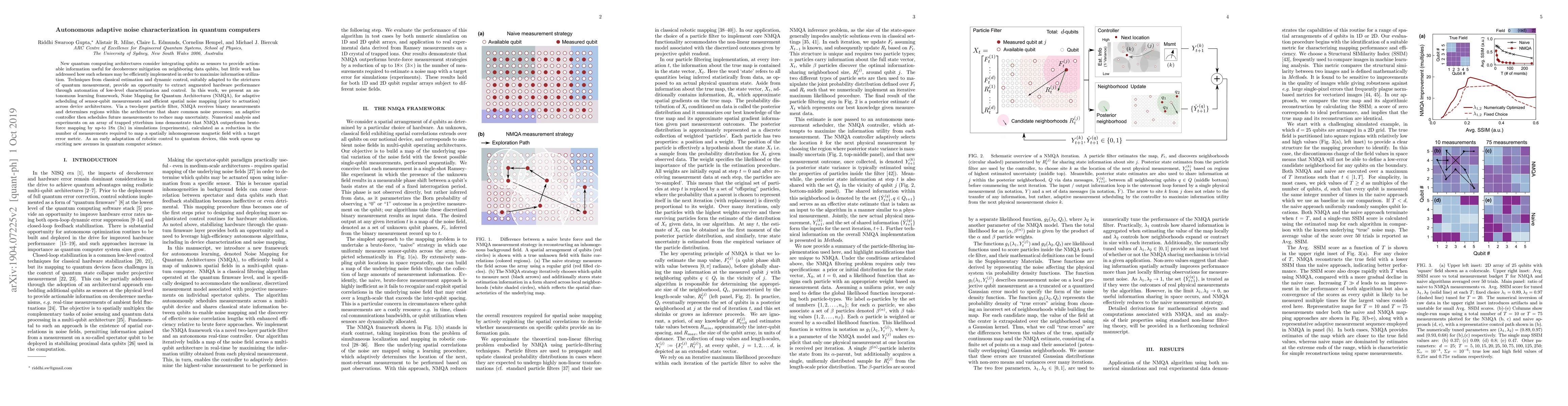 New quantum computing architectures consider integrating qubits as sensors to provide actionable information useful for decoherence mitigation on neighboring data qubits, but little work has addressed how such schemes may be efficiently implemented in order to maximize information utilization. Techniques from classical estimation and dynamic control, suitably adapted to the strictures of quantum measurement, provide an opportunity to extract augmented hardware performance through automation of low-level characterization and control. In this work, we present an autonomous learning framework, Noise Mapping for Quantum Architectures (NMQA), for adaptive scheduling of sensor-qubit measurements and efficient spatial noise mapping (prior to actuation) across device architectures. Via a two-layer particle filter, NMQA receives binary measurements and determines regions within the architecture that share common noise processes; an adaptive controller then schedules future measurements to reduce map uncertainty. Numerical analysis and experiments on an array of trapped ytterbium ions demonstrate that NMQA outperforms brute-force mapping by up-to $18$x ($3$x) in simulations (experiments), calculated as a reduction in the number of measurements required to map a spatially inhomogeneous magnetic field with a target error metric. As an early adaptation of robotic control to quantum devices, this work opens up exciting new avenues in quantum computer science.