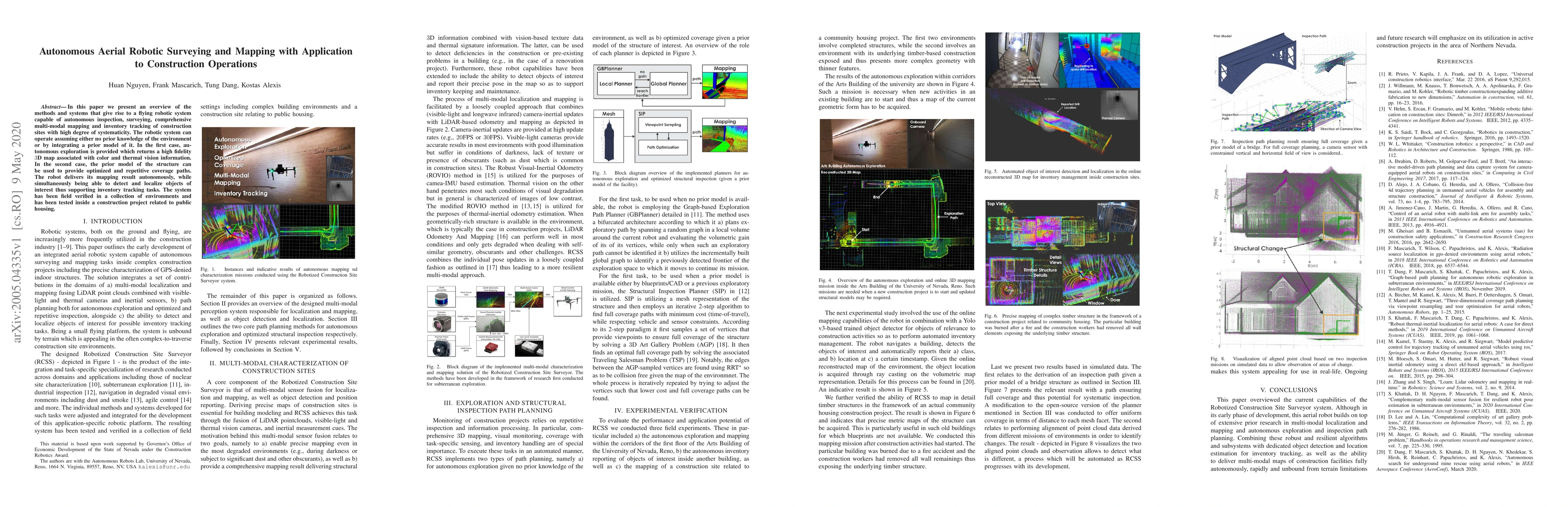 In this paper we present an overview of the methods and systems that give rise to a flying robotic system capable of autonomous inspection, surveying, comprehensive multi-modal mapping and inventory tracking of construction sites with high degree of systematicity. The robotic system can operate assuming either no prior knowledge of the environment or by integrating a prior model of it. In the first case, autonomous exploration is provided which returns a high fidelity $3\textrm{D}$ map associated with color and thermal vision information. In the second case, the prior model of the structure can be used to provide optimized and repetitive coverage paths. The robot delivers its mapping result autonomously, while simultaneously being able to detect and localize objects of interest thus supporting inventory tracking tasks. The system has been field verified in a collection of environments and has been tested inside a construction project related to public housing.