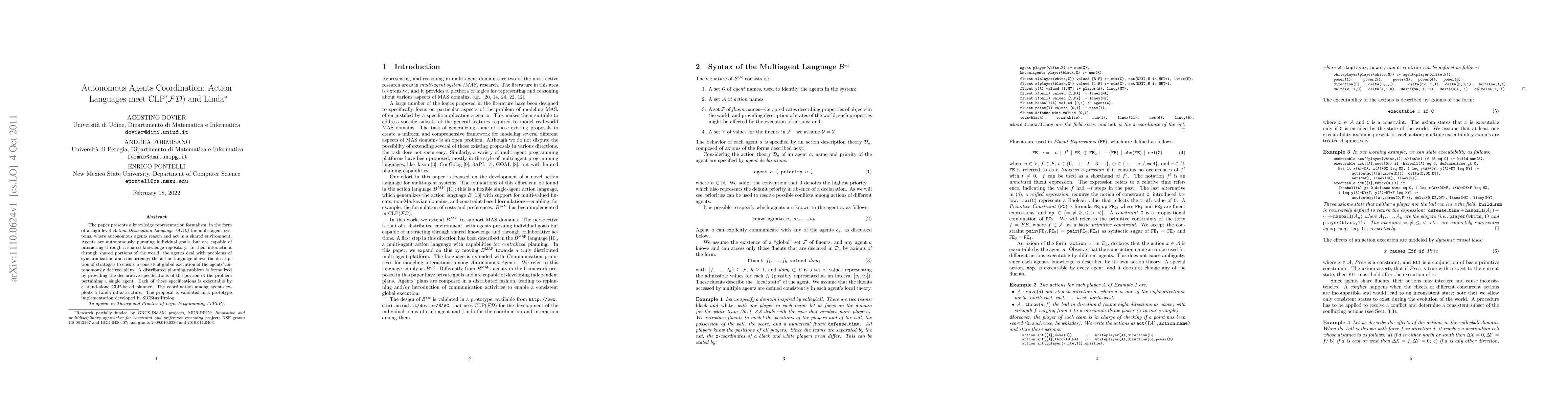 The paper presents a knowledge representation formalism, in the form of a high-level Action Description Language for multi-agent systems, where autonomous agents reason and act in a shared environment. Agents are autonomously pursuing individual goals, but are capable of interacting through a shared knowledge repository. In their interactions through shared portions of the world, the agents deal with problems of synchronization and concurrency; the action language allows the description of strategies to ensure a consistent global execution of the agents' autonomously derived plans. A distributed planning problem is formalized by providing the declarative specifications of the portion of the problem pertaining a single agent. Each of these specifications is executable by a stand-alone CLP-based planner. The coordination among agents exploits a Linda infrastructure. The proposal is validated in a prototype implementation developed in SICStus Prolog. To appear in Theory and Practice of Logic Programming (TPLP).