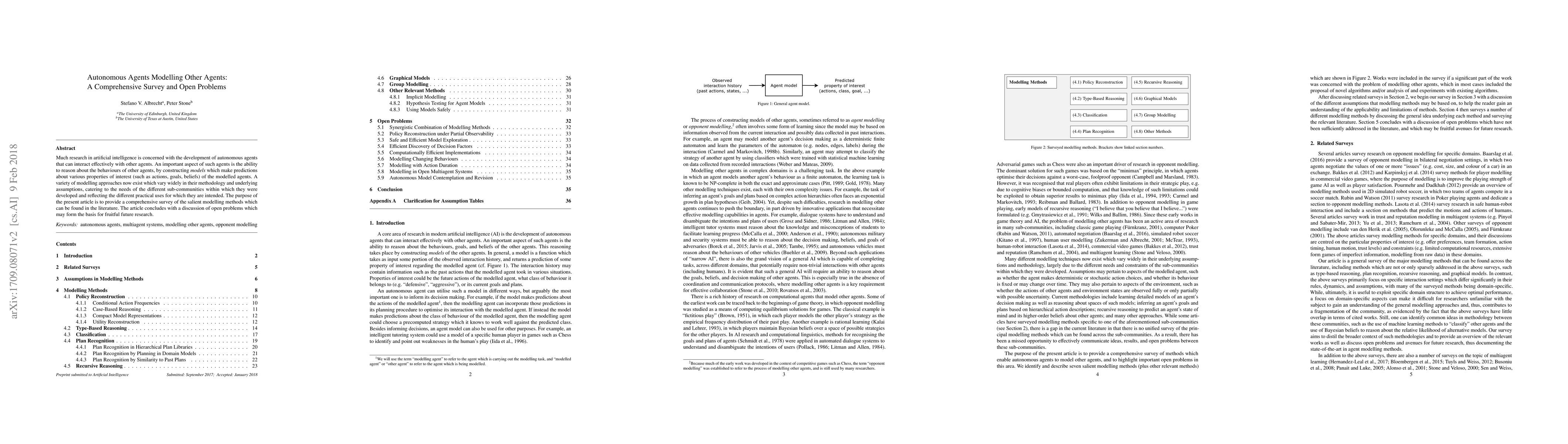 This paper surveys various methods used in AI to create models of other autonomous agents, focusing on predicting their actions, goals, and beliefs. It highlights diverse approaches, their applications, and identifies key open problems for future research.