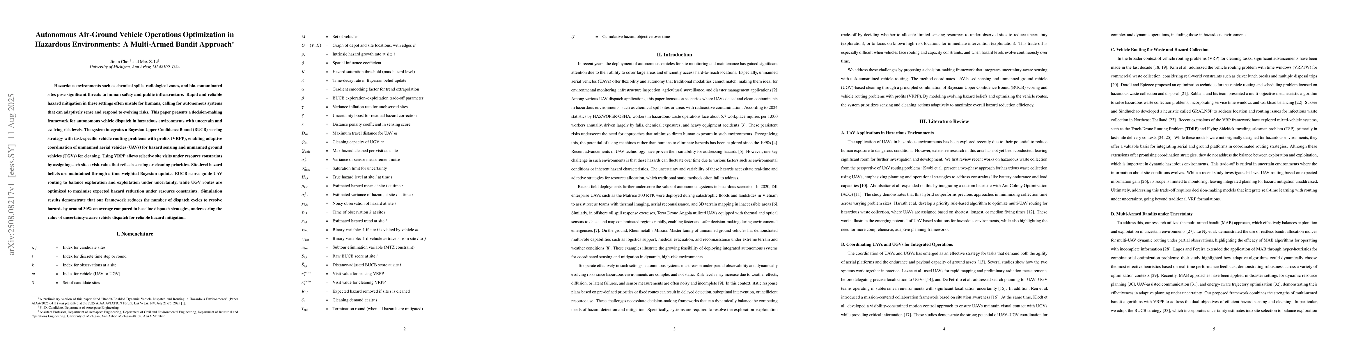 Hazardous environments such as chemical spills, radiological zones, and bio-contaminated sites pose significant threats to human safety and public infrastructure. Rapid and reliable hazard mitigation in these settings often unsafe for humans, calling for autonomous systems that can adaptively sense and respond to evolving risks. This paper presents a decision-making framework for autonomous vehicle dispatch in hazardous environments with uncertain and evolving risk levels. The system integrates a Bayesian Upper Confidence Bound (BUCB) sensing strategy with task-specific vehicle routing problems with profits (VRPP), enabling adaptive coordination of unmanned aerial vehicles (UAVs) for hazard sensing and unmanned ground vehicles (UGVs) for cleaning. Using VRPP allows selective site visits under resource constraints by assigning each site a visit value that reflects sensing or cleaning priorities. Site-level hazard beliefs are maintained through a time-weighted Bayesian update. BUCB scores guide UAV routing to balance exploration and exploitation under uncertainty, while UGV routes are optimized to maximize expected hazard reduction under resource constraints. Simulation results demonstrate that our framework reduces the number of dispatch cycles to resolve hazards by around 30% on average compared to baseline dispatch strategies, underscoring the value of uncertainty-aware vehicle dispatch for reliable hazard mitigation.