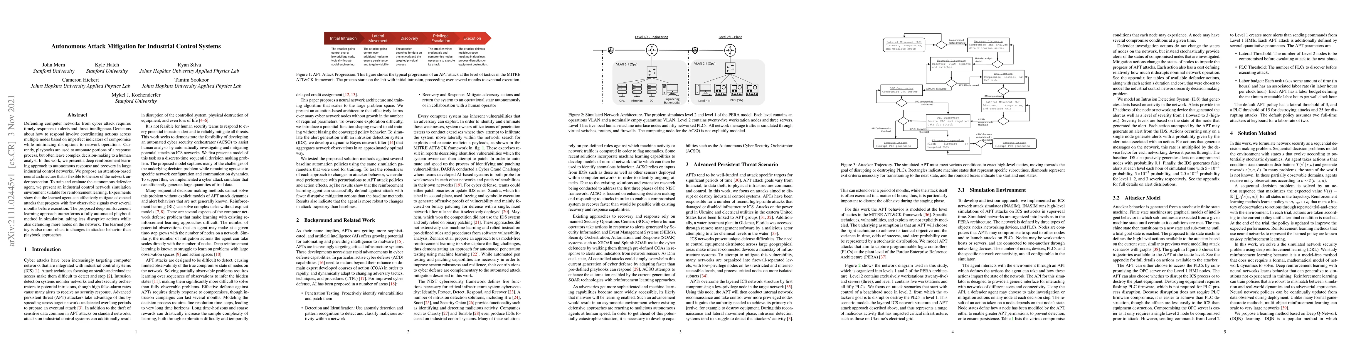 Defending computer networks from cyber attack requires timely responses to alerts and threat intelligence. Decisions about how to respond involve coordinating actions across multiple nodes based on imperfect indicators of compromise while minimizing disruptions to network operations. Currently, playbooks are used to automate portions of a response process, but often leave complex decision-making to a human analyst. In this work, we present a deep reinforcement learning approach to autonomous response and recovery in large industrial control networks. We propose an attention-based neural architecture that is flexible to the size of the network under protection. To train and evaluate the autonomous defender agent, we present an industrial control network simulation environment suitable for reinforcement learning. Experiments show that the learned agent can effectively mitigate advanced attacks that progress with few observable signals over several months before execution. The proposed deep reinforcement learning approach outperforms a fully automated playbook method in simulation, taking less disruptive actions while also defending more nodes on the network. The learned policy is also more robust to changes in attacker behavior than playbook approaches.