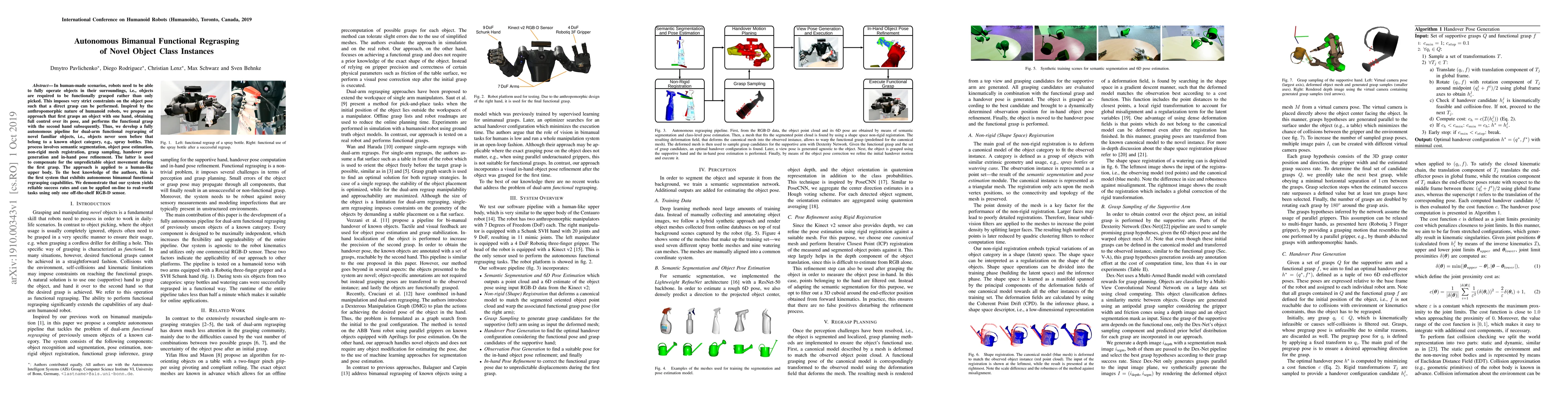 In human-made scenarios, robots need to be able to fully operate objects in their surroundings, i.e., objects are required to be functionally grasped rather than only picked. This imposes very strict constraints on the object pose such that a direct grasp can be performed. Inspired by the anthropomorphic nature of humanoid robots, we propose an approach that first grasps an object with one hand, obtaining full control over its pose, and performs the functional grasp with the second hand subsequently. Thus, we develop a fully autonomous pipeline for dual-arm functional regrasping of novel familiar objects, i.e., objects never seen before that belong to a known object category, e.g., spray bottles. This process involves semantic segmentation, object pose estimation, non-rigid mesh registration, grasp sampling, handover pose generation and in-hand pose refinement. The latter is used to compensate for the unpredictable object movement during the first grasp. The approach is applied to a human-like upper body. To the best knowledge of the authors, this is the first system that exhibits autonomous bimanual functional regrasping capabilities. We demonstrate that our system yields reliable success rates and can be applied on-line to real-world tasks using only one off-the-shelf RGB-D sensor.