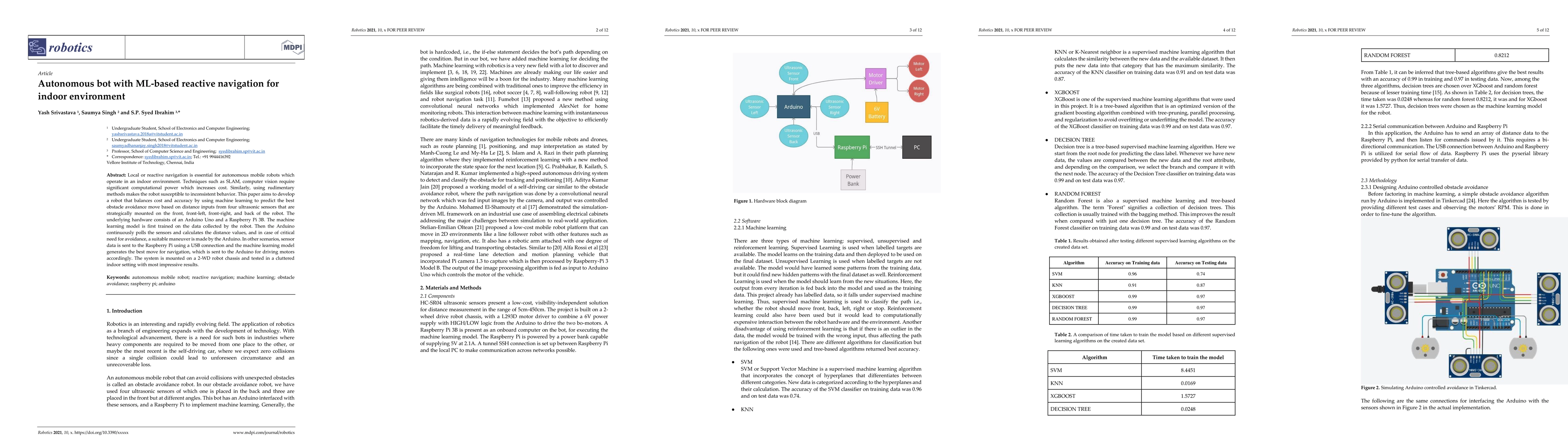 This paper develops an autonomous bot using machine learning for reactive navigation in indoor environments, balancing cost and accuracy by predicting optimal obstacle avoidance maneuvers based on ultrasonic sensor inputs. The system employs an Arduino Uno and Raspberry Pi 3B, with the Arduino handling immediate responses and the Raspberry Pi processing data for strategic navigation.