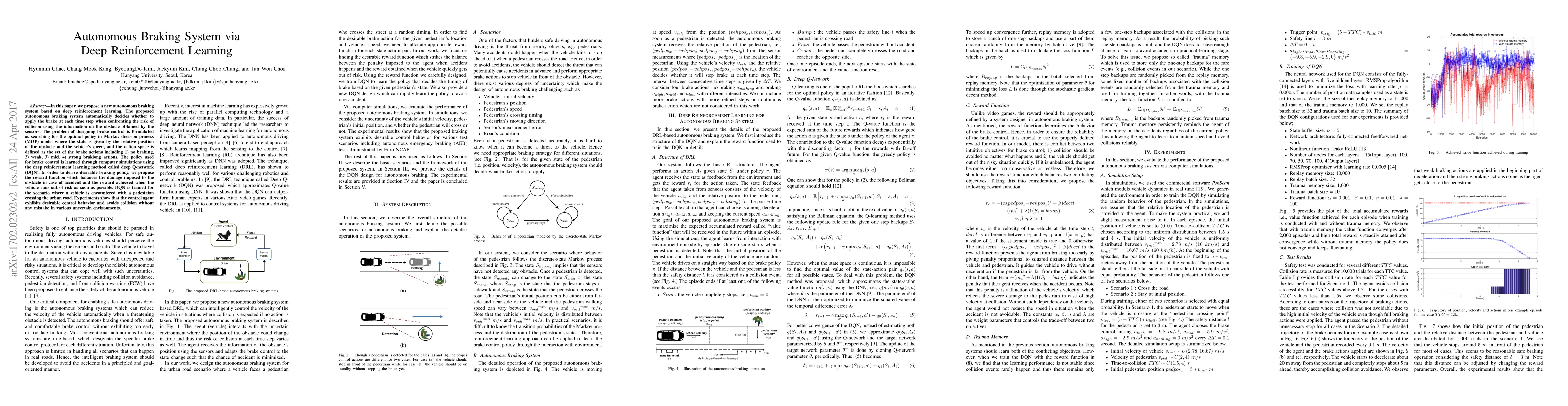 This paper proposes an autonomous braking system using deep reinforcement learning to decide whether to apply brakes to avoid collisions. The system learns optimal braking policies through deep Q-networks in simulations, balancing collision damage and quick risk resolution, and demonstrates successful collision avoidance in various scenarios.