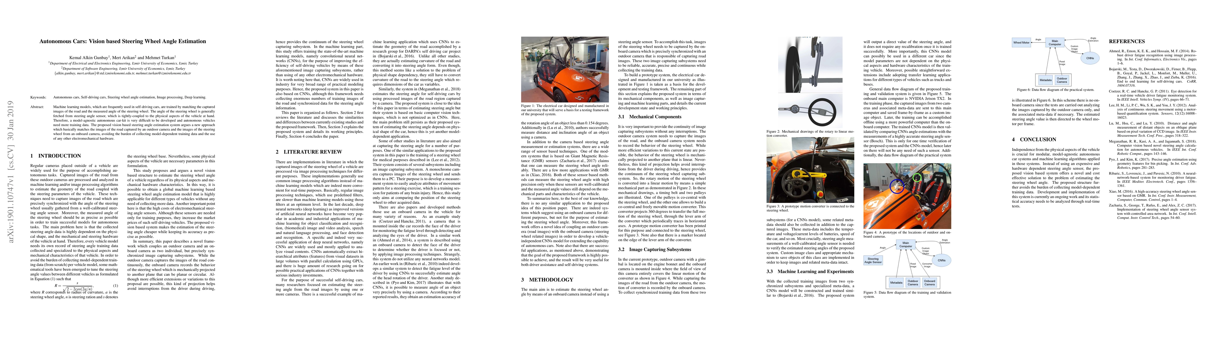 Machine learning models, which are frequently used in self-driving cars, are trained by matching the captured images of the road and the measured angle of the steering wheel. The angle of the steering wheel is generally fetched from steering angle sensor, which is tightly-coupled to the physical aspects of the vehicle at hand. Therefore, a model-agnostic autonomous car-kit is very difficult to be developed and autonomous vehicles need more training data. The proposed vision based steering angle estimation system argues a new approach which basically matches the images of the road captured by an outdoor camera and the images of the steering wheel from an onboard camera, avoiding the burden of collecting model-dependent training data and the use of any other electromechanical hardware.