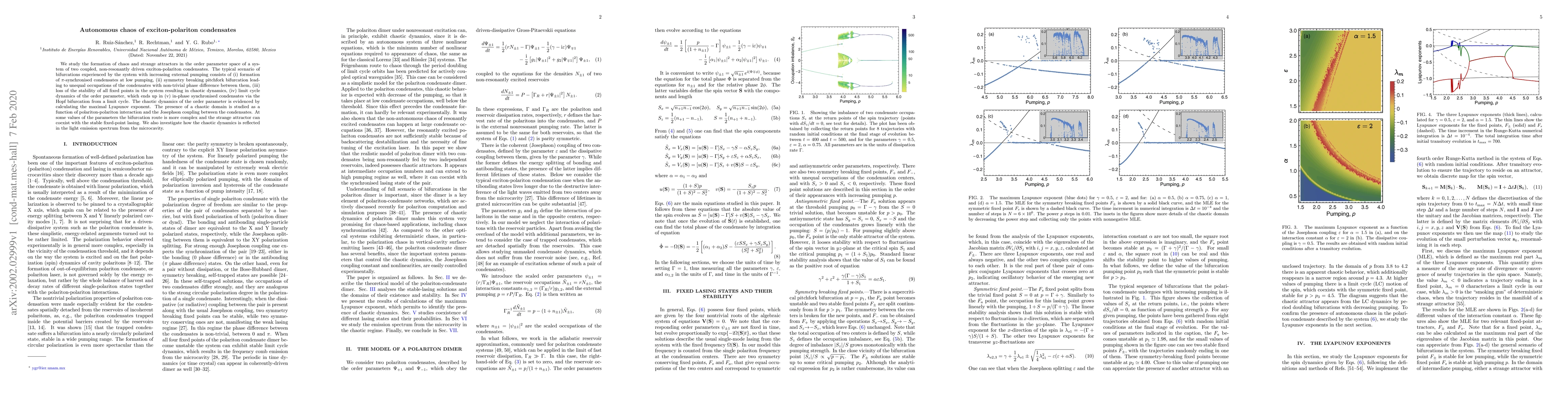 This paper investigates the chaotic dynamics and bifurcations in exciton-polariton condensates, revealing a route from synchronized states through symmetry breaking to chaotic behavior, evidenced by maximal Lyapunov exponent calculations, and explores the interplay between polariton interactions and Josephson coupling. The study also examines the impact of chaotic dynamics on the emitted light spectrum.