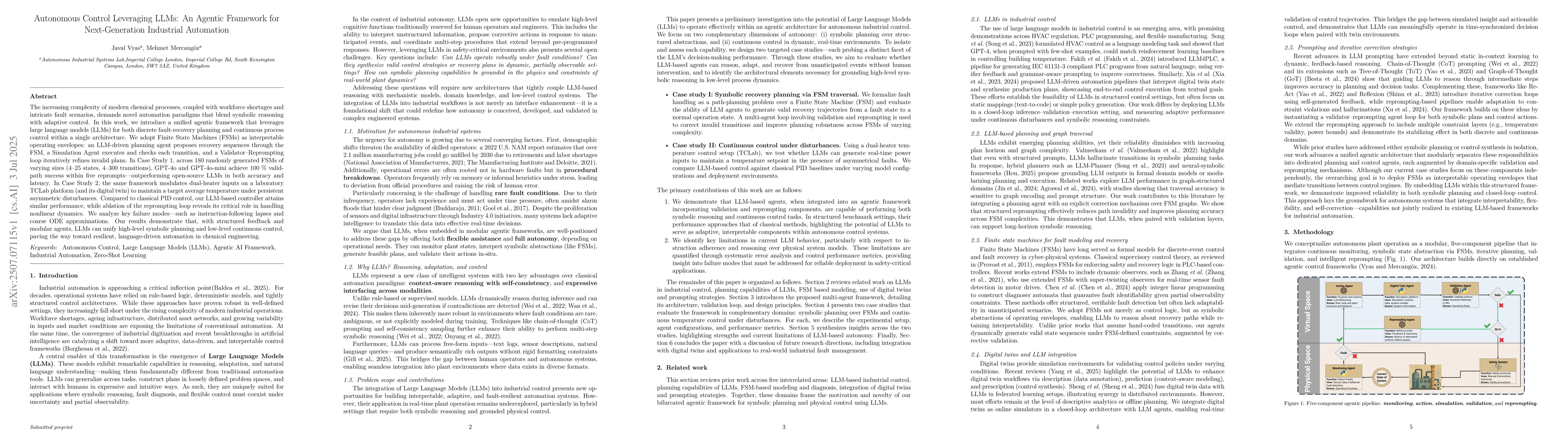 The increasing complexity of modern chemical processes, coupled with workforce shortages and intricate fault scenarios, demands novel automation paradigms that blend symbolic reasoning with adaptive control. In this work, we introduce a unified agentic framework that leverages large language models (LLMs) for both discrete fault-recovery planning and continuous process control within a single architecture. We adopt Finite State Machines (FSMs) as interpretable operating envelopes: an LLM-driven planning agent proposes recovery sequences through the FSM, a Simulation Agent executes and checks each transition, and a Validator-Reprompting loop iteratively refines invalid plans. In Case Study 1, across 180 randomly generated FSMs of varying sizes (4-25 states, 4-300 transitions), GPT-4o and GPT-4o-mini achieve 100% valid-path success within five reprompts-outperforming open-source LLMs in both accuracy and latency. In Case Study 2, the same framework modulates dual-heater inputs on a laboratory TCLab platform (and its digital twin) to maintain a target average temperature under persistent asymmetric disturbances. Compared to classical PID control, our LLM-based controller attains similar performance, while ablation of the prompting loop reveals its critical role in handling nonlinear dynamics. We analyze key failure modes-such as instruction following lapses and coarse ODE approximations. Our results demonstrate that, with structured feedback and modular agents, LLMs can unify high-level symbolic planningand low-level continuous control, paving the way towards resilient, language-driven automation in chemical engineering.