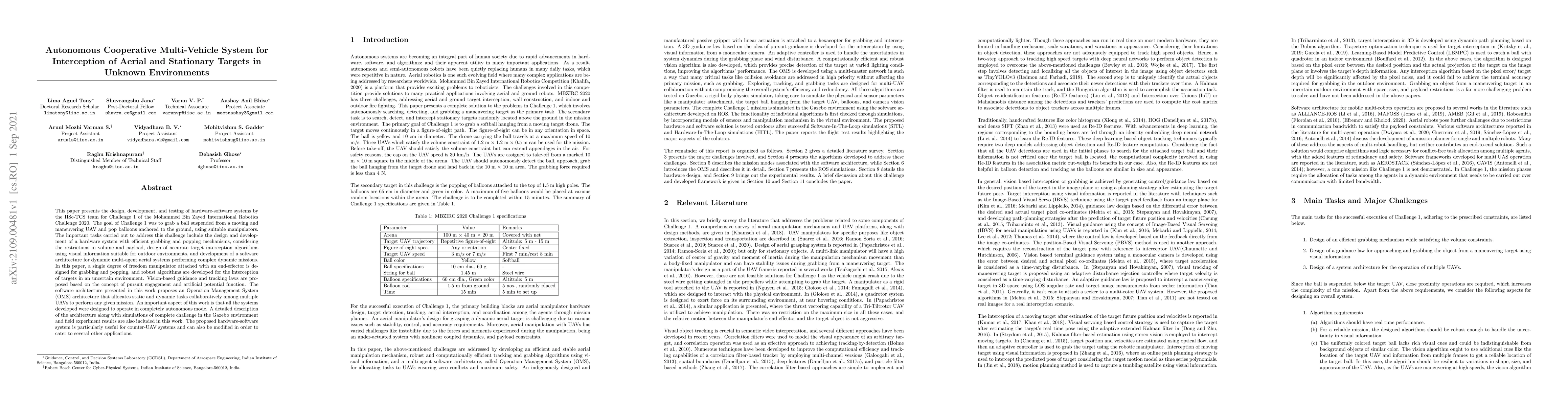 This paper presents the design, development, and testing of hardware-software systems by the IISc-TCS team for Challenge 1 of the Mohammed Bin Zayed International Robotics Challenge 2020. The goal of Challenge 1 was to grab a ball suspended from a moving and maneuvering UAV and pop balloons anchored to the ground, using suitable manipulators. The important tasks carried out to address this challenge include the design and development of a hardware system with efficient grabbing and popping mechanisms, considering the restrictions in volume and payload, design of accurate target interception algorithms using visual information suitable for outdoor environments, and development of a software architecture for dynamic multi-agent aerial systems performing complex dynamic missions. In this paper, a single degree of freedom manipulator attached with an end-effector is designed for grabbing and popping, and robust algorithms are developed for the interception of targets in an uncertain environment. Vision-based guidance and tracking laws are proposed based on the concept of pursuit engagement and artificial potential function. The software architecture presented in this work proposes an Operation Management System (OMS) architecture that allocates static and dynamic tasks collaboratively among multiple UAVs to perform any given mission. An important aspect of this work is that all the systems developed were designed to operate in completely autonomous mode. A detailed description of the architecture along with simulations of complete challenge in the Gazebo environment and field experiment results are also included in this work. The proposed hardware-software system is particularly useful for counter-UAV systems and can also be modified in order to cater to several other applications.
