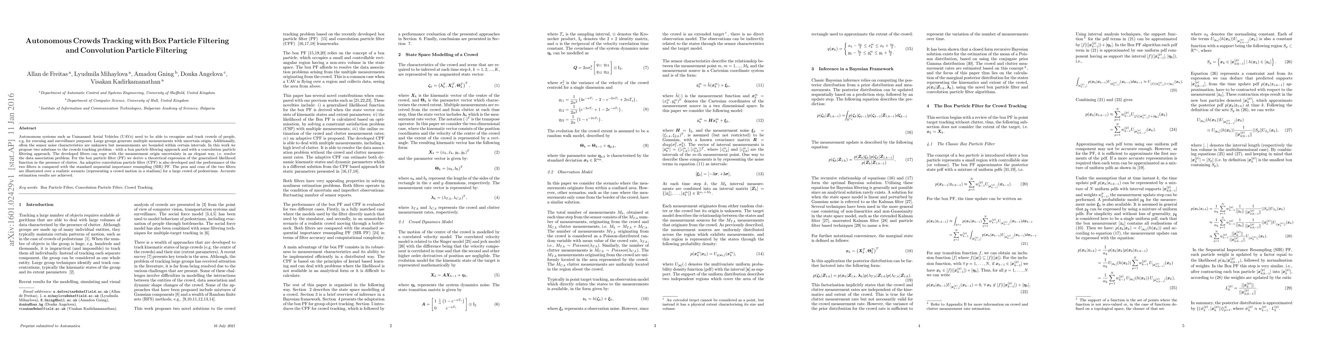 Autonomous systems such as Unmanned Aerial Vehicles (UAVs) need to be able to recognise and track crowds of people, e.g. for rescuing and surveillance purposes. Large groups generate multiple measurements with uncertain origin. Additionally, often the sensor noise characteristics are unknown but measurements are bounded within certain intervals. In this work we propose two solutions to the crowds tracking problem - with a box particle filtering approach and with a convolution particle filtering approach. The developed filters can cope with the measurement origin uncertainty in an elegant way, i.e. resolve the data association problem. For the box particle filter (PF) we derive a theoretical expression of the generalised likelihood function in the presence of clutter. An adaptive convolution particle filter (CPF) is also developed and the performance of the two filters is compared with the standard sequential importance resampling (SIR) PF. The pros and cons of the two filters are illustrated over a realistic scenario (representing a crowd motion in a stadium) for a large crowd of pedestrians. Accurate estimation results are achieved.