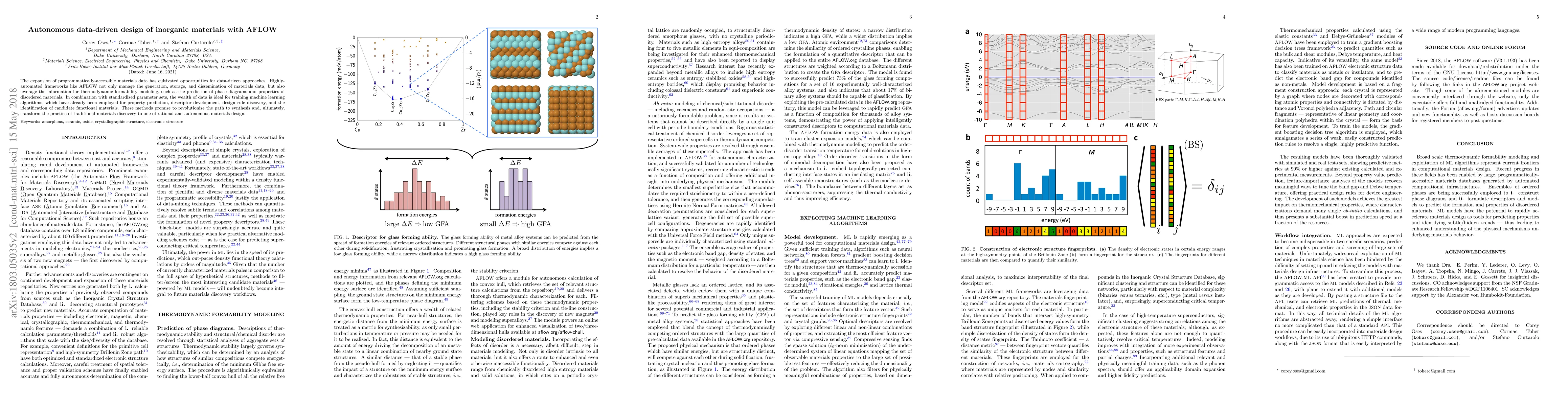 This paper discusses how the AFLOW framework enables highly-automated, data-driven design of inorganic materials through machine learning, using extensive materials data for predicting phase diagrams and material properties, thus transforming traditional materials discovery into a rational, autonomous process.