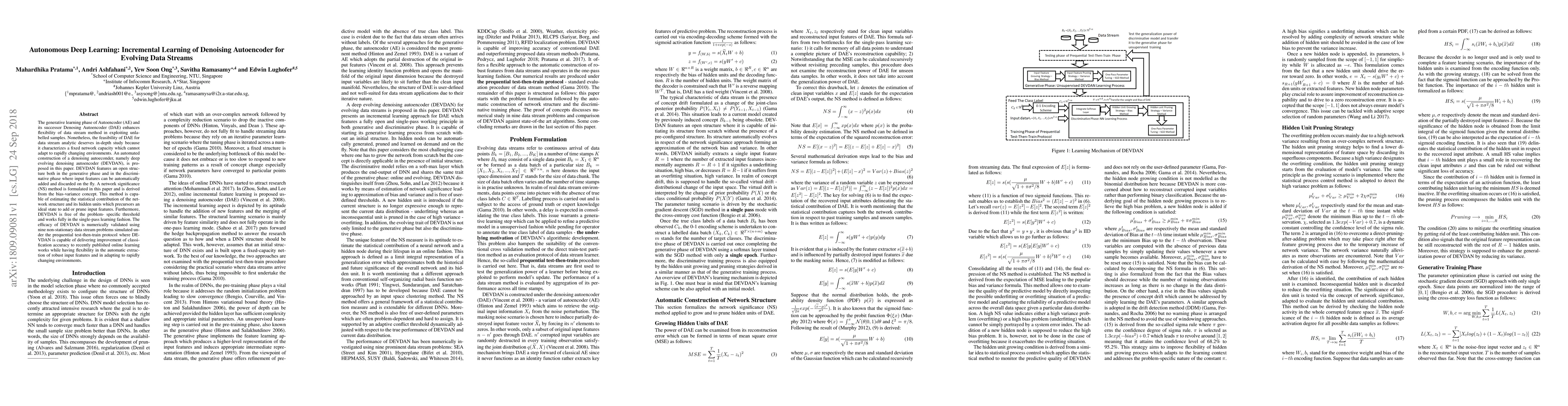 The generative learning phase of Autoencoder (AE) and its successor Denosing Autoencoder (DAE) enhances the flexibility of data stream method in exploiting unlabelled samples. Nonetheless, the feasibility of DAE for data stream analytic deserves in-depth study because it characterizes a fixed network capacity which cannot adapt to rapidly changing environments. An automated construction of a denoising autoeconder, namely deep evolving denoising autoencoder (DEVDAN), is proposed in this paper. DEVDAN features an open structure both in the generative phase and in the discriminative phase where input features can be automatically added and discarded on the fly. A network significance (NS) method is formulated in this paper and is derived from the bias-variance concept. This method is capable of estimating the statistical contribution of the network structure and its hidden units which precursors an ideal state to add or prune input features. Furthermore, DEVDAN is free of the problem- specific threshold and works fully in the single-pass learning fashion. The efficacy of DEVDAN is numerically validated using nine non-stationary data stream problems simulated under the prequential test-then-train protocol where DEVDAN is capable of delivering an improvement of classification accuracy to recently published online learning works while having flexibility in the automatic extraction of robust input features and in adapting to rapidly changing environments.