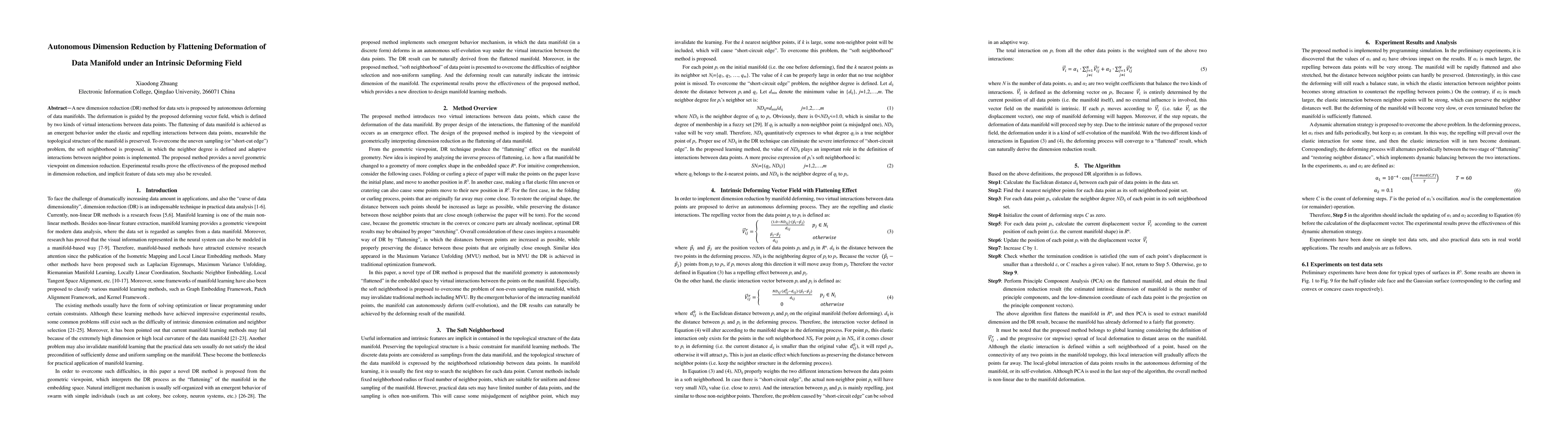 A new dimension reduction (DR) method for data sets is proposed by autonomous deforming of data manifolds. The deformation is guided by the proposed deforming vector field, which is defined by two kinds of virtual interactions between data points. The flattening of data manifold is achieved as an emergent behavior under the elastic and repelling interactions between data points, meanwhile the topological structure of the manifold is preserved. To overcome the uneven sampling (or "short-cut edge") problem, the soft neighborhood is proposed, in which the neighbor degree is defined and adaptive interactions between neighbor points is implemented. The proposed method provides a novel geometric viewpoint on dimension reduction. Experimental results prove the effectiveness of the proposed method in dimension reduction, and implicit feature of data sets may also be revealed.