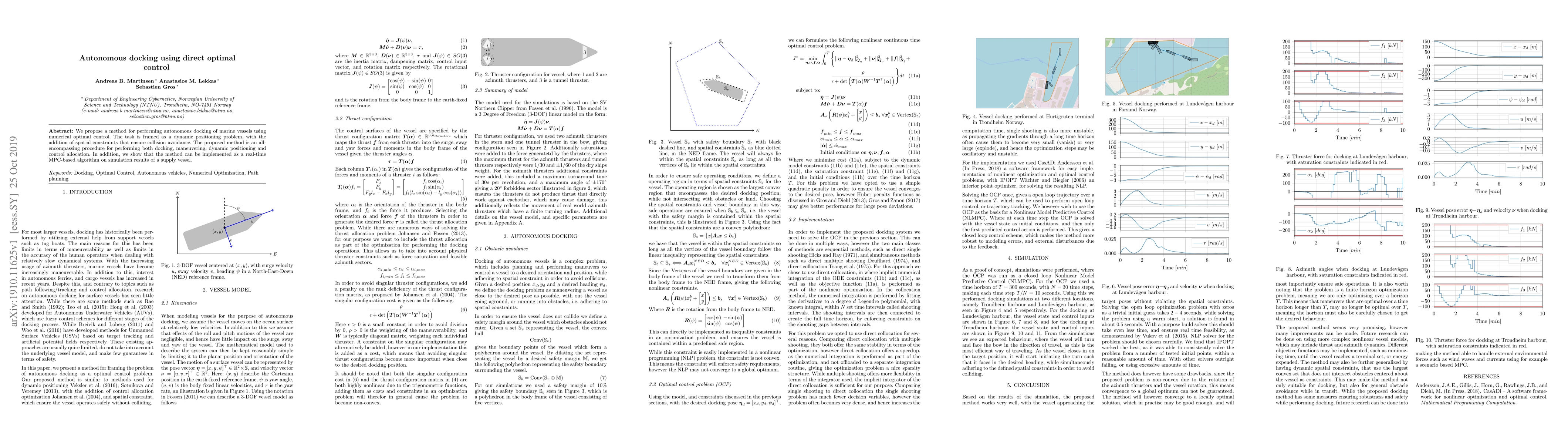 This paper presents a method for autonomous marine vessel docking using numerical optimal control, framing it as a dynamic positioning problem with collision avoidance. The proposed real-time MPC-based algorithm effectively handles docking, maneuvering, dynamic positioning, and control allocation, demonstrated through simulation results of a supply vessel.