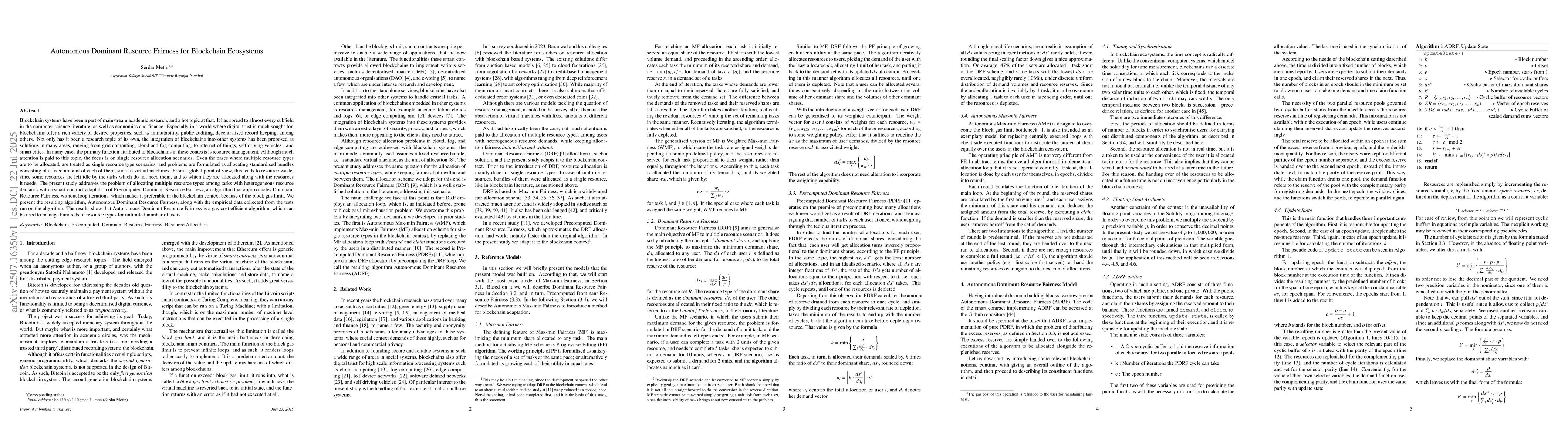 Blockchain systems have been a part of mainstream academic research, and a hot topic at that. It has spread to almost every subfield in the computer science literature, as well as economics and finance. Especially in a world where digital trust is much sought for, blockchains offer a rich variety of desired properties, such as immutability, public auditing, decentralised record keeping, among others. Not only has it been a research topic of its own, the integration of blockchains into other systems has been proposed as solutions in many areas, ranging from grid computing, cloud and fog computing, to internet of things, self driving vehicles , and smart cities. In many cases the primary function attributed to blockchains in these contexts is resource management. Although much attention is paid to this topic, the focus is on single resource allocation scenarios. Even the cases where multiple resource types are to be allocated, are treated as single resource type scenarios, and problems are formulated as allocating standardised bundles consisting of a fixed amount of each of them, such as virtual machines. The present study addresses the problem of allocating multiple resource types among tasks with heterogeneous resource demands with a smart contract adaptation of Precomputed Dominant Resource Fairness; an algorithm that approximates Dominant Resource Fairness, without loop iterations, which makes it preferable in the blockchain context because of the block gas limit. We present the resulting algorithm, Autonomous Dominant Resource Fairness, along with the empirical data collected from the tests run on the algorithm. The results show that Autonomous Dominant Resource Fairness is a gas-cost efficient algorithm, which can be used to manage hundreds of resource types for unlimited number of users.