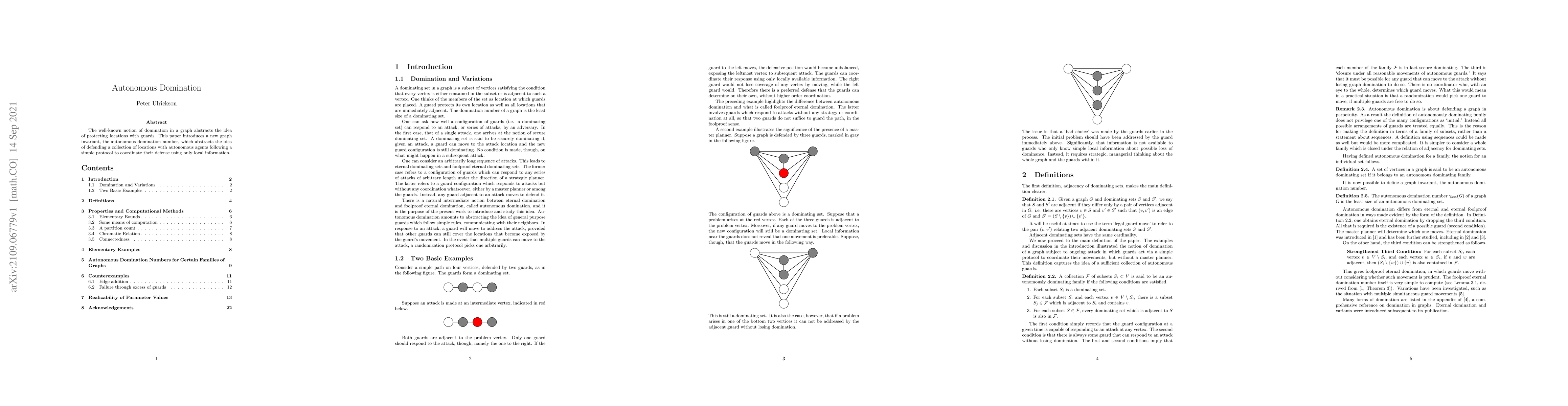 The well-known notion of domination in a graph abstracts the idea of protecting locations with guards. This paper introduces a new graph invariant, the autonomous domination number, which abstracts the idea of defending a collection of locations with autonomous agents following a simple protocol to coordinate their defense using only local information.