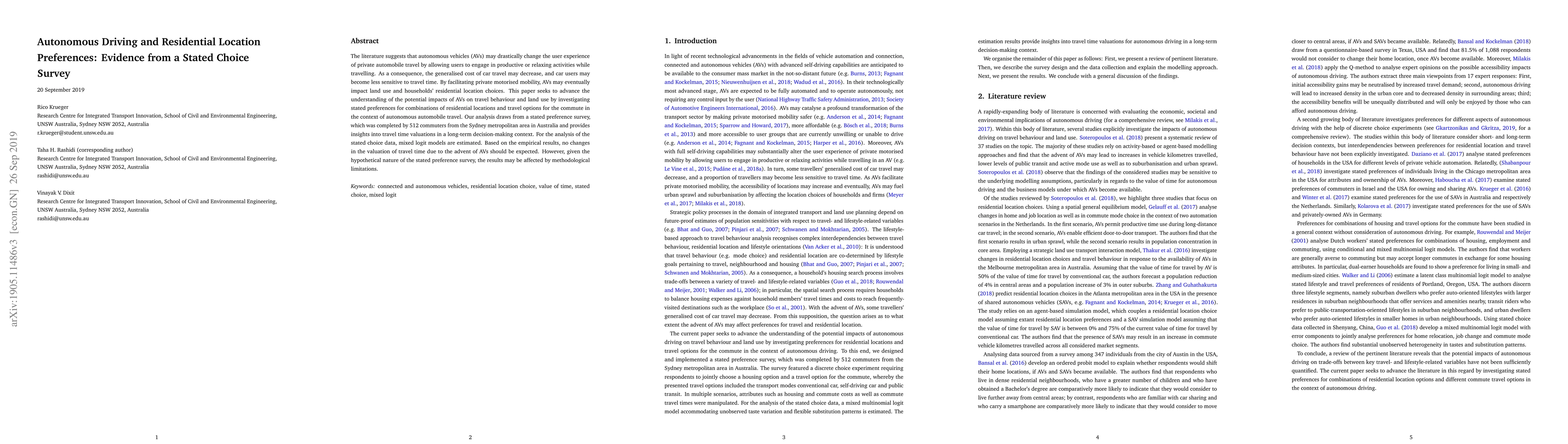 This paper investigates how autonomous vehicles (AVs) might influence residential location preferences by analyzing stated choices from a survey of 512 Sydney commuters. The study finds no significant change in travel time valuations due to AVs, suggesting that AVs may not drastically alter residential location decisions. However, the hypothetical nature of the survey may introduce methodological limitations.