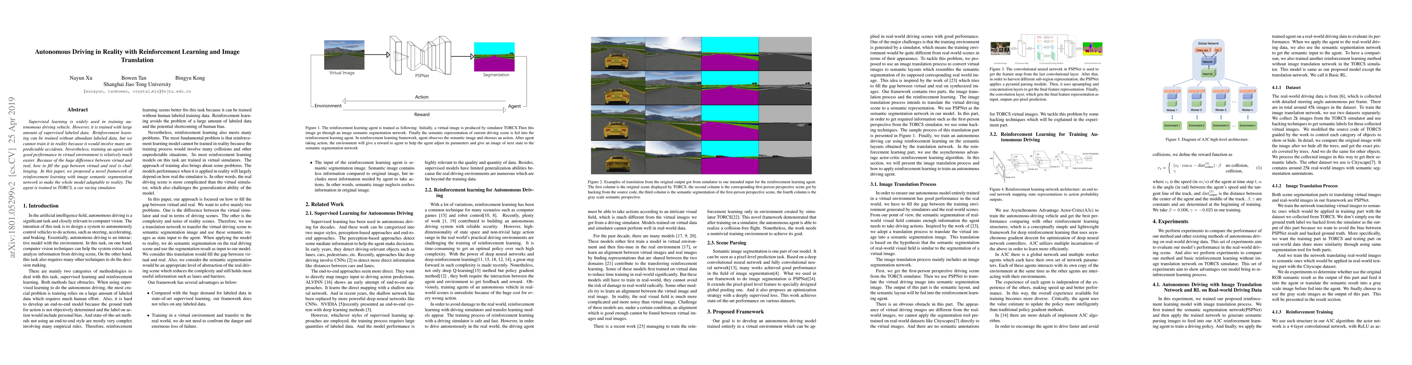 This paper proposes a reinforcement learning framework with an image semantic segmentation network to bridge the gap between virtual and real environments for autonomous driving. The agent is trained in a simulator, TORCS, aiming to achieve better adaptability to real-world conditions.