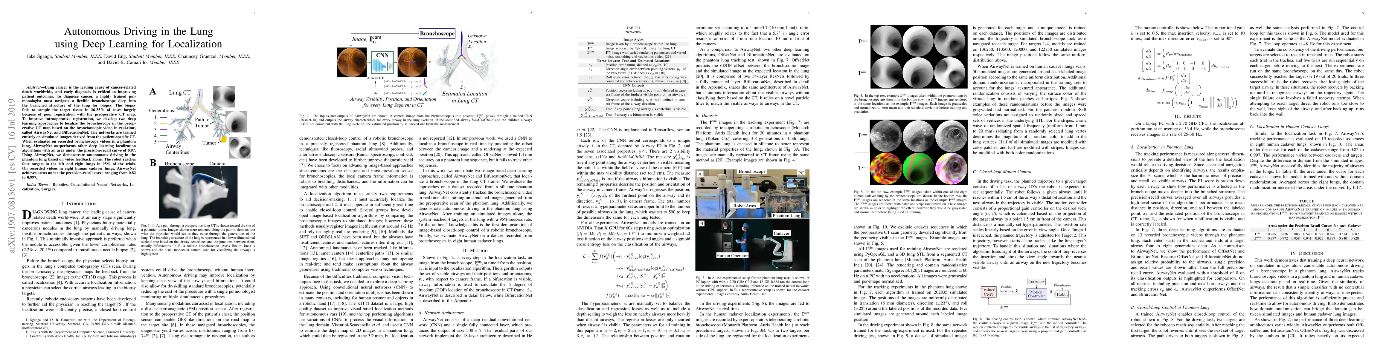 Lung cancer is the leading cause of cancer-related death worldwide, and early diagnosis is critical to improving patient outcomes. To diagnose cancer, a highly trained pulmonologist must navigate a flexible bronchoscope deep into the branched structure of the lung for biopsy. The biopsy fails to sample the target tissue in 26-33% of cases largely because of poor registration with the preoperative CT map. To improve intraoperative registration, we develop two deep learning approaches to localize the bronchoscope in the preoperative CT map based on the bronchoscopic video in real-time, called AirwayNet and BifurcationNet. The networks are trained entirely on simulated images derived from the patient-specific CT. When evaluated on recorded bronchoscopy videos in a phantom lung, AirwayNet outperforms other deep learning localization algorithms with an area under the precision-recall curve of 0.97. Using AirwayNet, we demonstrate autonomous driving in the phantom lung based on video feedback alone. The robot reaches four targets in the left and right lungs in 95% of the trials. On recorded videos in eight human cadaver lungs, AirwayNet achieves areas under the precision-recall curve ranging from 0.82 to 0.997.