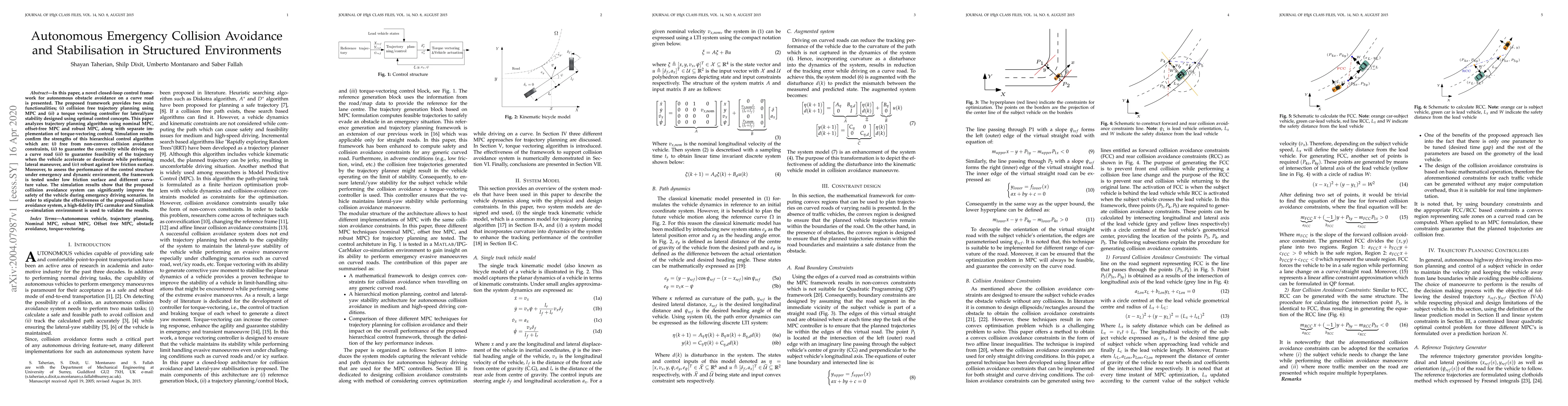 In this paper, a novel closed-loop control framework for autonomous obstacle avoidance on a curve road is presented. The proposed framework provides two main functionalities; (i) collision free trajectory planning using MPC and (ii) a torque vectoring controller for lateral/yaw stability designed using optimal control concepts. This paper analyzes trajectory planning algorithm using nominal MPC, offset-free MPC and robust MPC, along with separate implementation of torque-vectoring control. Simulation results confirm the strengths of this hierarchical control algorithm which are: (i) free from non-convex collision avoidance constraints, (ii) to guarantee the convexity while driving on a curve road (iii) to guarantee feasibility of the trajectory when the vehicle accelerate or decelerate while performing lateral maneuver, and (iv) robust against low friction surface. Moreover, to assess the performance of the control structure under emergency and dynamic environment, the framework is tested under low friction surface and different curvature value. The simulation results show that the proposed collision avoidance system can significantly improve the safety of the vehicle during emergency driving scenarios. In order to stipulate the effectiveness of the proposed collision avoidance system, a high-fidelity IPG carmaker and Simulink co-simulation environment is used to validate the results.