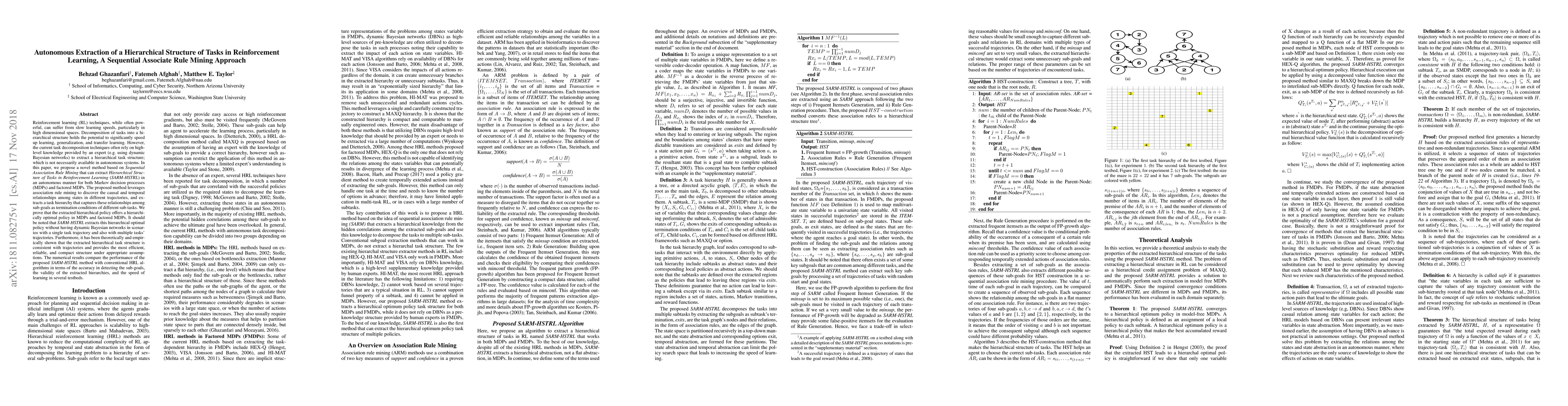 This paper proposes a novel method for autonomously extracting a hierarchical structure of tasks in reinforcement learning using Sequential Association Rule Mining (SARM-HSTRL). The method discovers causal and temporal relationships among states to create a hierarchical policy without relying on expert knowledge, demonstrating improved learning speed and efficiency compared to conventional hierarchical reinforcement learning algorithms.