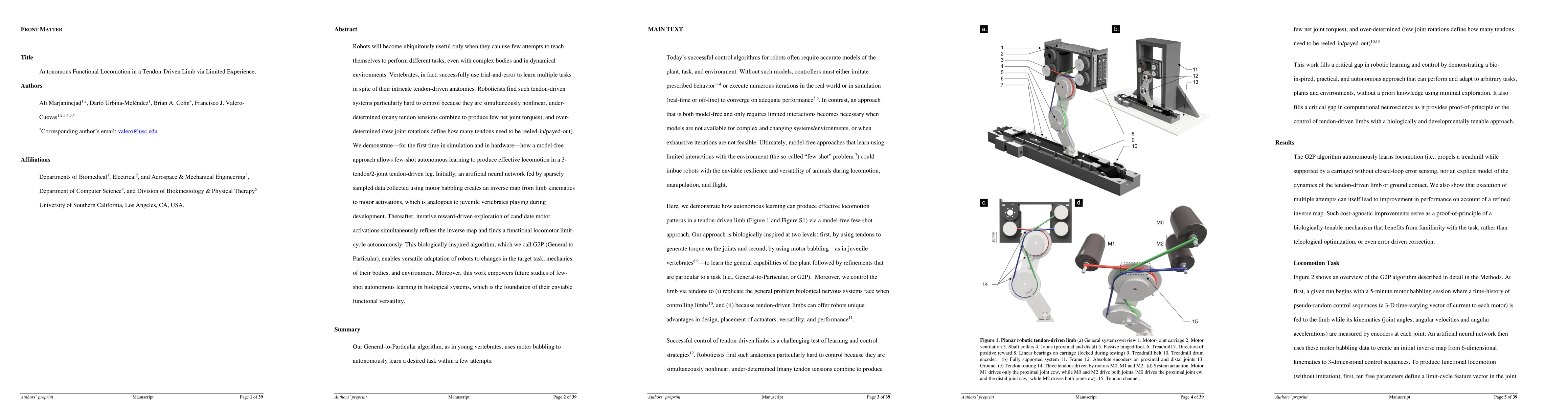 Robots will become ubiquitously useful only when they can use few attempts to teach themselves to perform different tasks, even with complex bodies and in dynamical environments. Vertebrates, in fact, successfully use trial-and-error to learn multiple tasks in spite of their intricate tendon-driven anatomies. Roboticists find such tendon-driven systems particularly hard to control because they are simultaneously nonlinear, under-determined (many tendon tensions combine to produce few net joint torques), and over-determined (few joint rotations define how many tendons need to be reeled-in/payed-out). We demonstrate---for the first time in simulation and in hardware---how a model-free approach allows few-shot autonomous learning to produce effective locomotion in a 3-tendon/2-joint tendon-driven leg. Initially, an artificial neural network fed by sparsely sampled data collected using motor babbling creates an inverse map from limb kinematics to motor activations, which is analogous to juvenile vertebrates playing during development. Thereafter, iterative reward-driven exploration of candidate motor activations simultaneously refines the inverse map and finds a functional locomotor limit-cycle autonomously. This biologically-inspired algorithm, which we call G2P (General to Particular), enables versatile adaptation of robots to changes in the target task, mechanics of their bodies, and environment. Moreover, this work empowers future studies of few-shot autonomous learning in biological systems, which is the foundation of their enviable functional versatility.