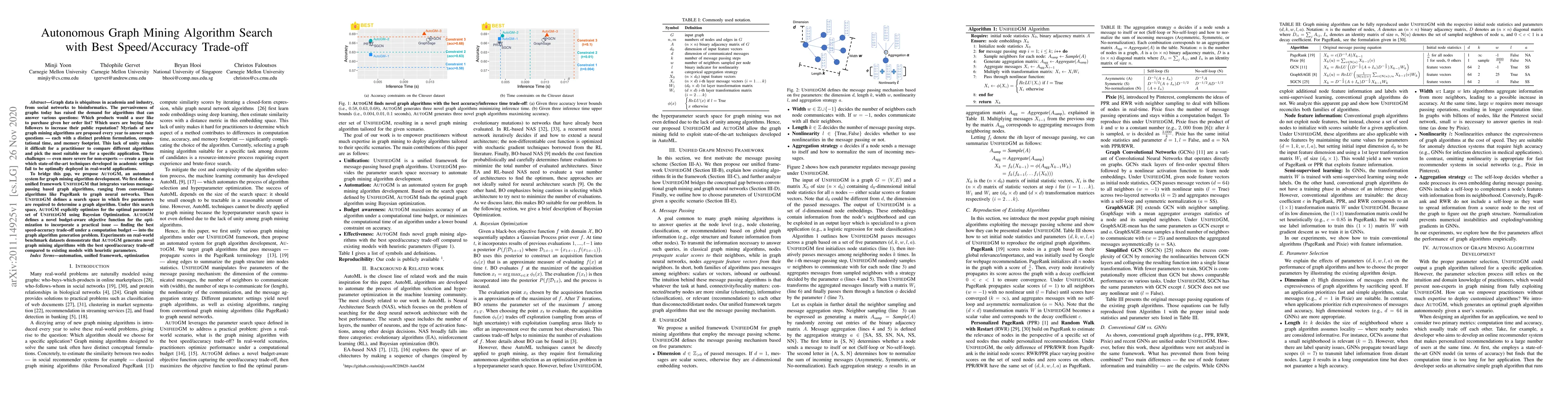Graph data is ubiquitous in academia and industry, from social networks to bioinformatics. The pervasiveness of graphs today has raised the demand for algorithms that can answer various questions: Which products would a user like to purchase given her order list? Which users are buying fake followers to increase their public reputation? Myriads of new graph mining algorithms are proposed every year to answer such questions - each with a distinct problem formulation, computational time, and memory footprint. This lack of unity makes it difficult for a practitioner to compare different algorithms and pick the most suitable one for a specific application. These challenges - even more severe for non-experts - create a gap in which state-of-the-art techniques developed in academic settings fail to be optimally deployed in real-world applications. To bridge this gap, we propose AUTOGM, an automated system for graph mining algorithm development. We first define a unified framework UNIFIEDGM that integrates various message-passing based graph algorithms, ranging from conventional algorithms like PageRank to graph neural networks. Then UNIFIEDGM defines a search space in which five parameters are required to determine a graph algorithm. Under this search space, AUTOGM explicitly optimizes for the optimal parameter set of UNIFIEDGM using Bayesian Optimization. AUTOGM defines a novel budget-aware objective function for the optimization to incorporate a practical issue - finding the best speed-accuracy trade-off under a computation budget - into the graph algorithm generation problem. Experiments on real-world benchmark datasets demonstrate that AUTOGM generates novel graph mining algorithms with the best speed/accuracy trade-off compared to existing models with heuristic parameters.