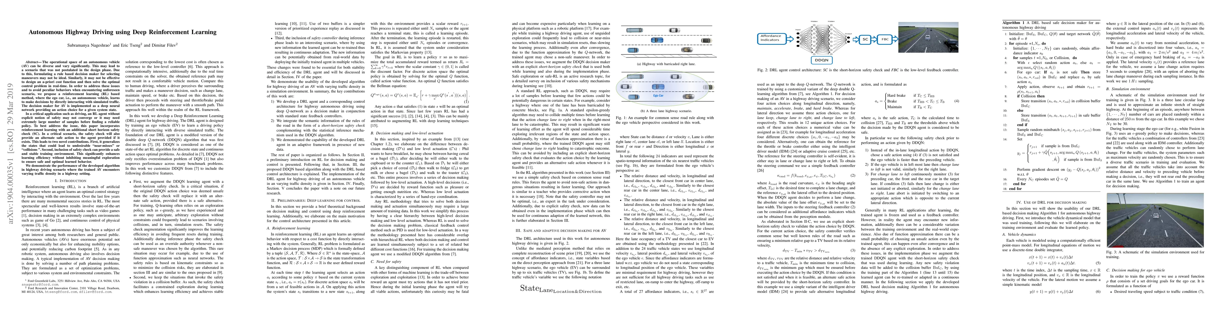The operational space of an autonomous vehicle (AV) can be diverse and vary significantly. This may lead to a scenario that was not postulated in the design phase. Due to this, formulating a rule based decision maker for selecting maneuvers may not be ideal. Similarly, it may not be effective to design an a-priori cost function and then solve the optimal control problem in real-time. In order to address these issues and to avoid peculiar behaviors when encountering unforeseen scenario, we propose a reinforcement learning (RL) based method, where the ego car, i.e., an autonomous vehicle, learns to make decisions by directly interacting with simulated traffic. The decision maker for AV is implemented as a deep neural network providing an action choice for a given system state. In a critical application such as driving, an RL agent without explicit notion of safety may not converge or it may need extremely large number of samples before finding a reliable policy. To best address the issue, this paper incorporates reinforcement learning with an additional short horizon safety check (SC). In a critical scenario, the safety check will also provide an alternate safe action to the agent provided if it exists. This leads to two novel contributions. First, it generalizes the states that could lead to undesirable "near-misses" or "collisions ". Second, inclusion of safety check can provide a safe and stable training environment. This significantly enhances learning efficiency without inhibiting meaningful exploration to ensure safe and optimal learned behavior. We demonstrate the performance of the developed algorithm in highway driving scenario where the trained AV encounters varying traffic density in a highway setting.