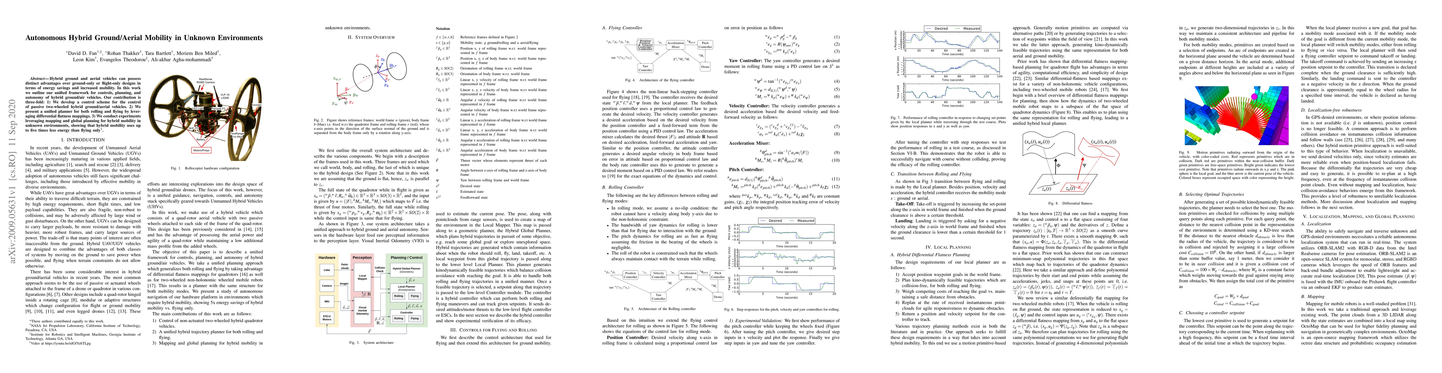 This paper presents a unified framework for the control, planning, and autonomy of hybrid ground/aerial vehicles, focusing on energy efficiency and mobility. The authors develop a control scheme for passive two-wheeled hybrid vehicles, a unified planner leveraging differential flatness, and demonstrate significant energy savings in unknown environments.