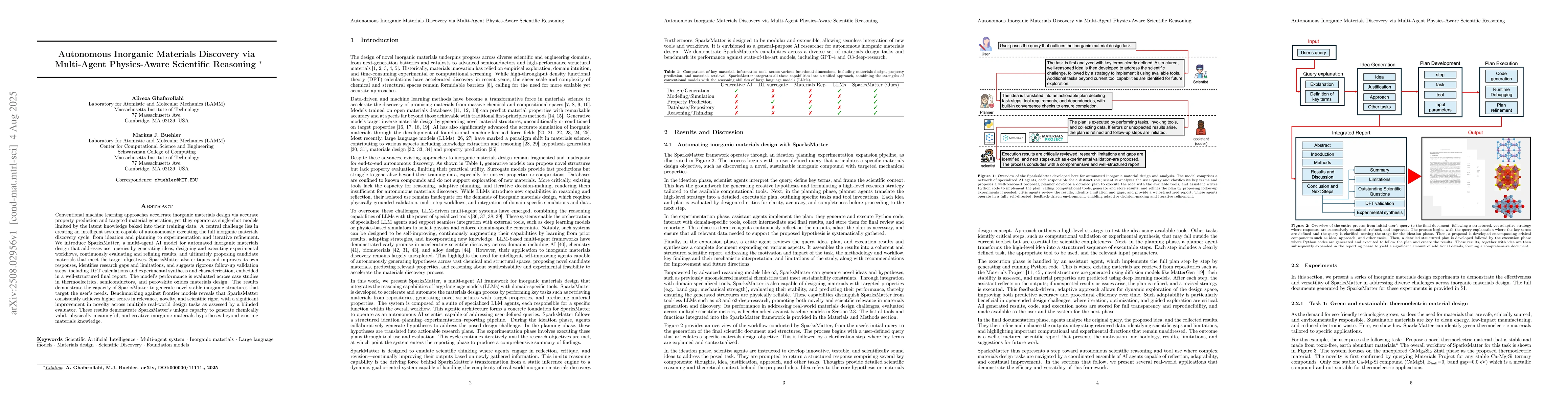 Introduces SparksMatter, a multi-agent AI model for automated inorganic materials design, capable of generating ideas, designing experiments, evaluating results, and proposing candidate materials.