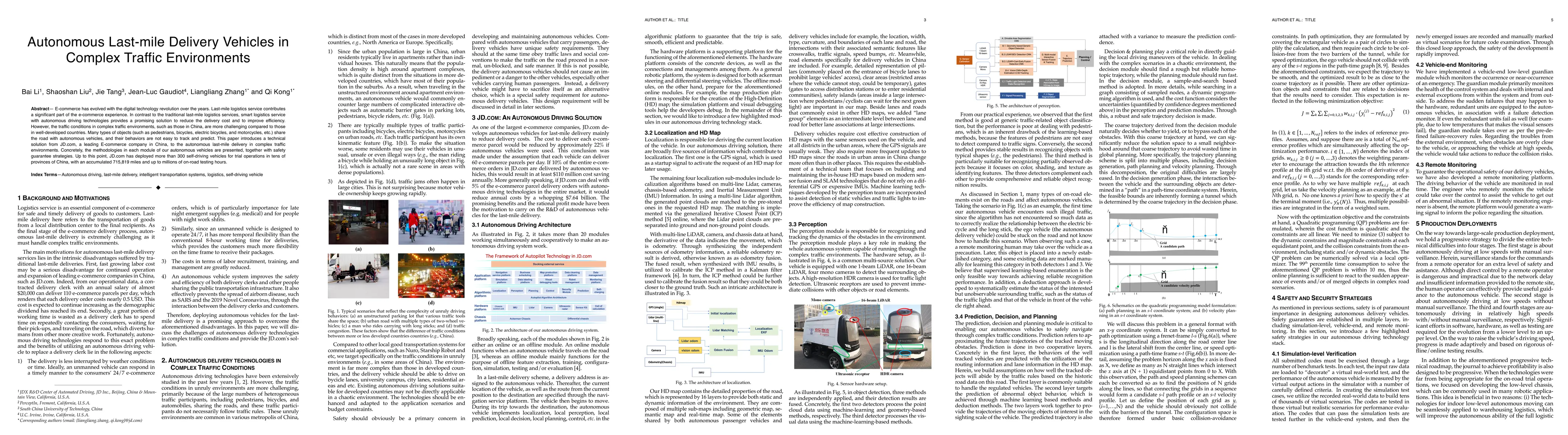 This paper presents JD.com's technical solution for autonomous last-mile delivery in complex Chinese traffic environments, detailing methodologies and safety strategies across vehicle modules, and reports on successful trial operations with over 300 self-driving vehicles covering millions of testing hours.