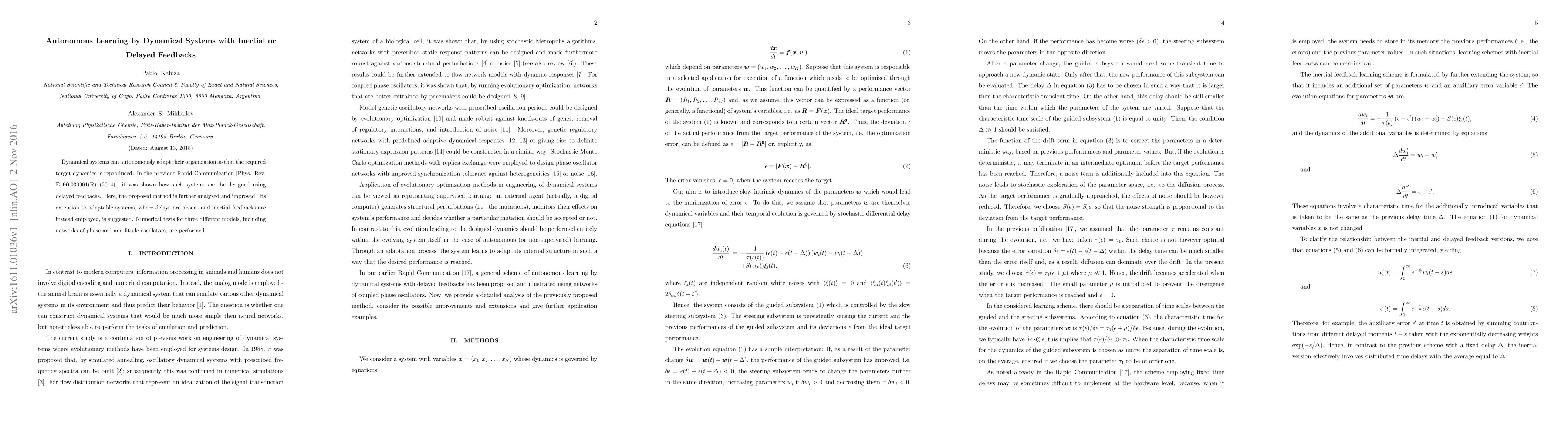 This paper explores autonomous learning in dynamical systems using inertial or delayed feedback mechanisms, extending previous work on delayed feedbacks. Numerical tests on various models, including oscillator networks, demonstrate the effectiveness of inertial feedbacks in achieving target dynamics.