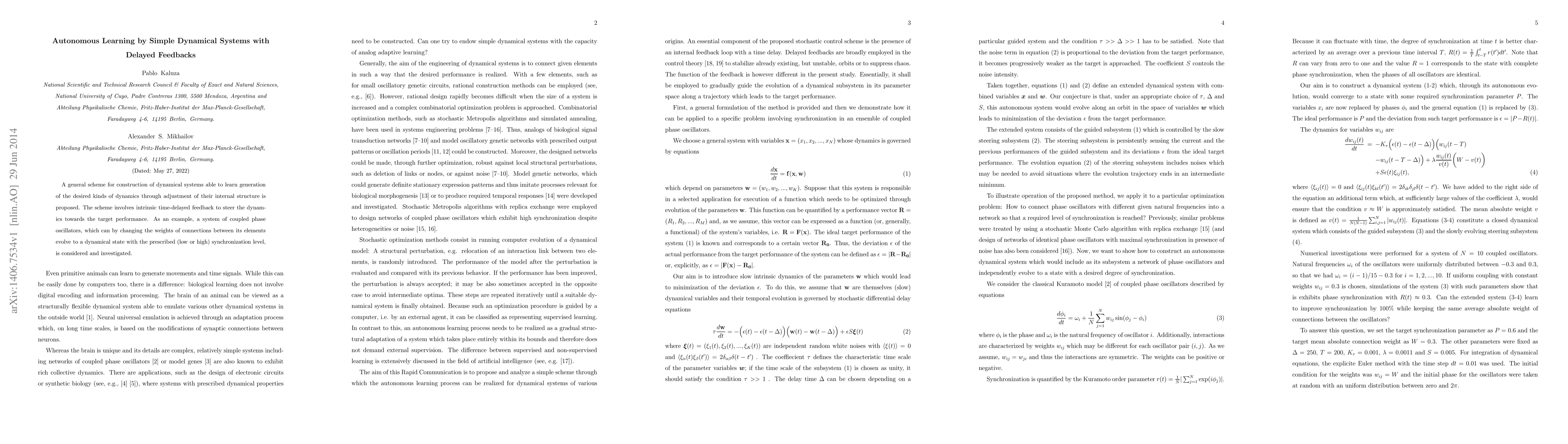 This paper proposes a method for constructing dynamical systems that can autonomously learn desired dynamics through intrinsic time-delayed feedback, exemplified by a system of coupled phase oscillators adjusting connection weights to achieve prescribed synchronization levels.