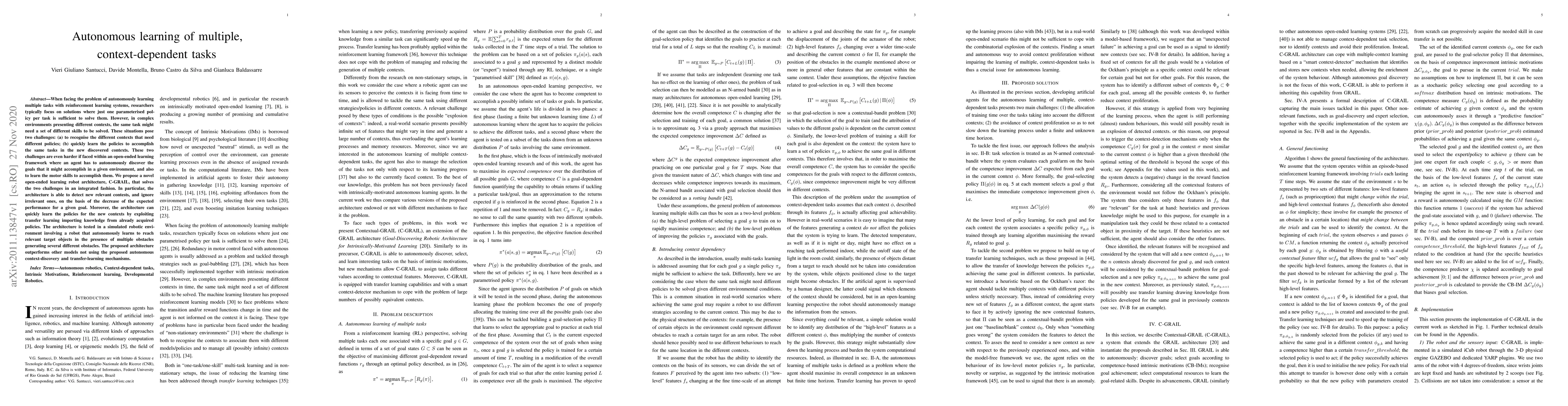 The paper proposes C-GRAIL, a novel open-ended learning robot architecture that autonomously learns multiple context-dependent tasks by detecting relevant contexts and quickly adapting policies using transfer learning. The architecture outperforms other models in a simulated environment where it learns to reach targets amidst various obstacles.