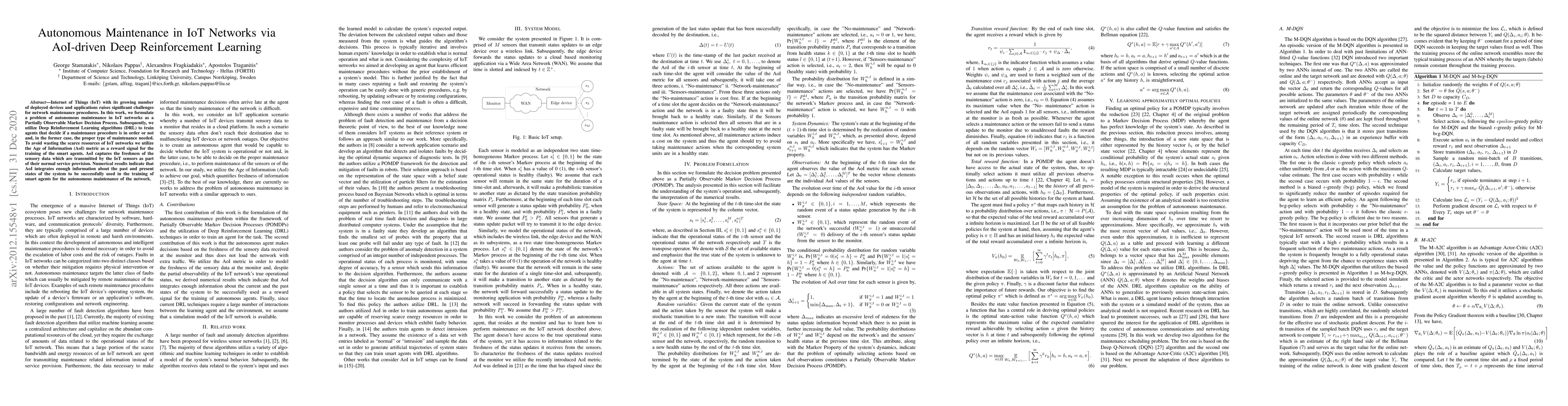 This paper explores the use of Deep Reinforcement Learning (DRL) to automate maintenance in IoT networks, framing it as a Partially Observable Markov Decision Process. The Age of Information (AoI) metric is employed as a reward signal to optimize the freshness of data, ensuring efficient resource utilization and effective autonomous maintenance.