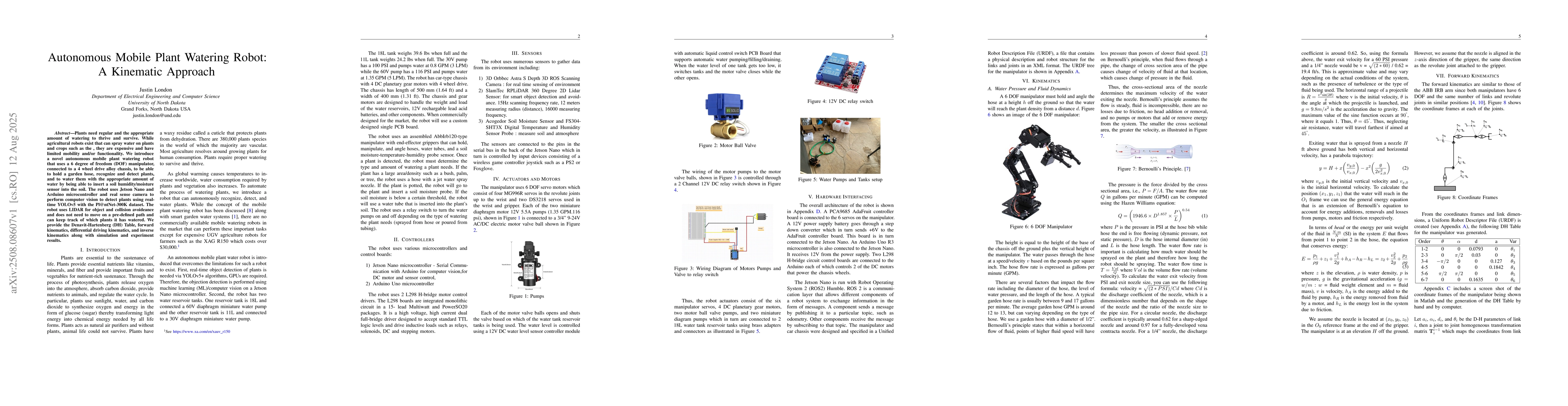 Plants need regular and the appropriate amount of watering to thrive and survive. While agricultural robots exist that can spray water on plants and crops such as the , they are expensive and have limited mobility and/or functionality. We introduce a novel autonomous mobile plant watering robot that uses a 6 degree of freedom (DOF) manipulator, connected to a 4 wheel drive alloy chassis, to be able to hold a garden hose, recognize and detect plants, and to water them with the appropriate amount of water by being able to insert a soil humidity/moisture sensor into the soil. The robot uses Jetson Nano and Arduino microcontroller and real sense camera to perform computer vision to detect plants using real-time YOLOv5 with the Pl@ntNet-300K dataset. The robot uses LIDAR for object and collision avoideance and does not need to move on a pre-defined path and can keep track of which plants it has watered. We provide the Denavit-Hartenberg (DH) Table, forward kinematics, differential driving kinematics, and inverse kinematics along with simulation and experiment results