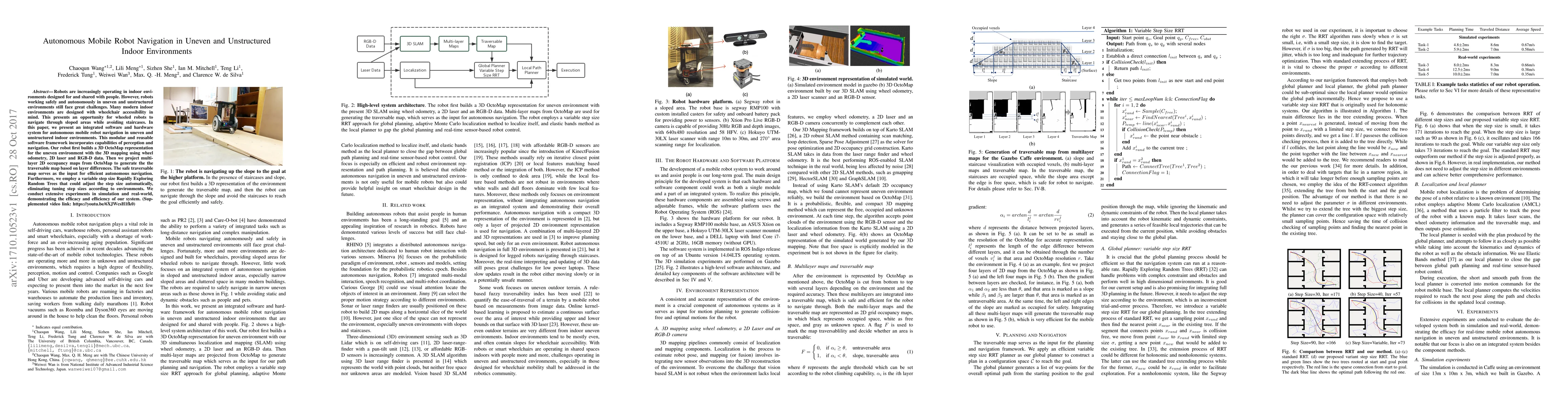 This paper presents a software and hardware system for autonomous navigation of mobile robots in uneven and unstructured indoor environments, utilizing a 3D OctoMap for mapping and a variable step size navigation algorithm to efficiently navigate through sloped areas while avoiding staircases. Experiments show the system’s effectiveness in both simulated and real-world settings.