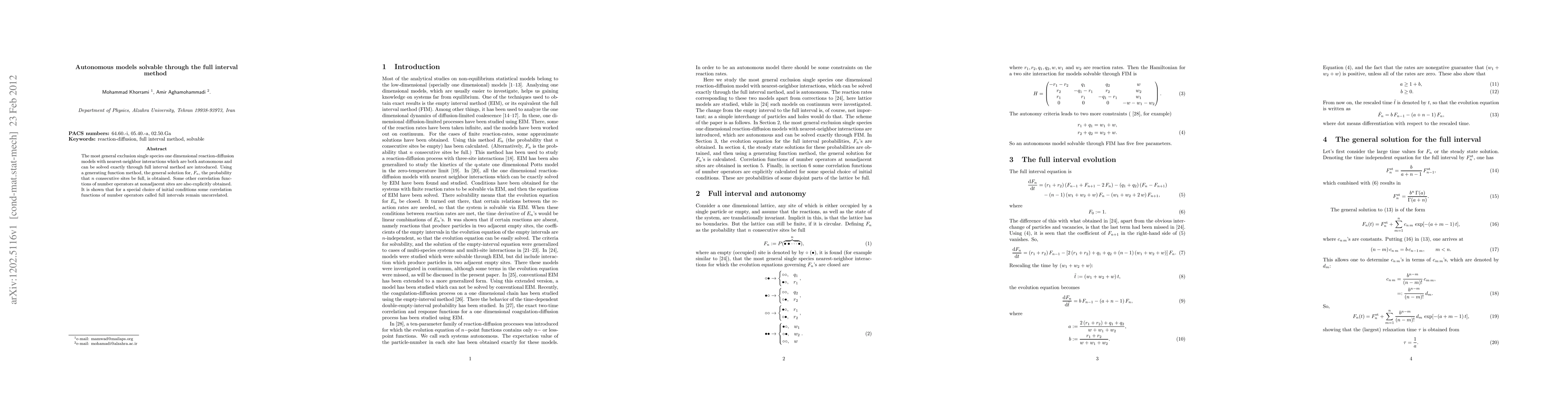 The most general exclusion single species one dimensional reaction-diffusion models with nearest-neighbor interactions which are both autonomous and can be solved exactly through full interval method are introduced. Using a generating function method, the general solution for, $F_n$, the probability that $n$ consecutive sites be full, is obtained. Some other correlation functions of number operators at nonadjacent sites are also explicitly obtained. It is shown that for a special choice of initial conditions some correlation functions of number operators called full intervals remain uncorrelated.