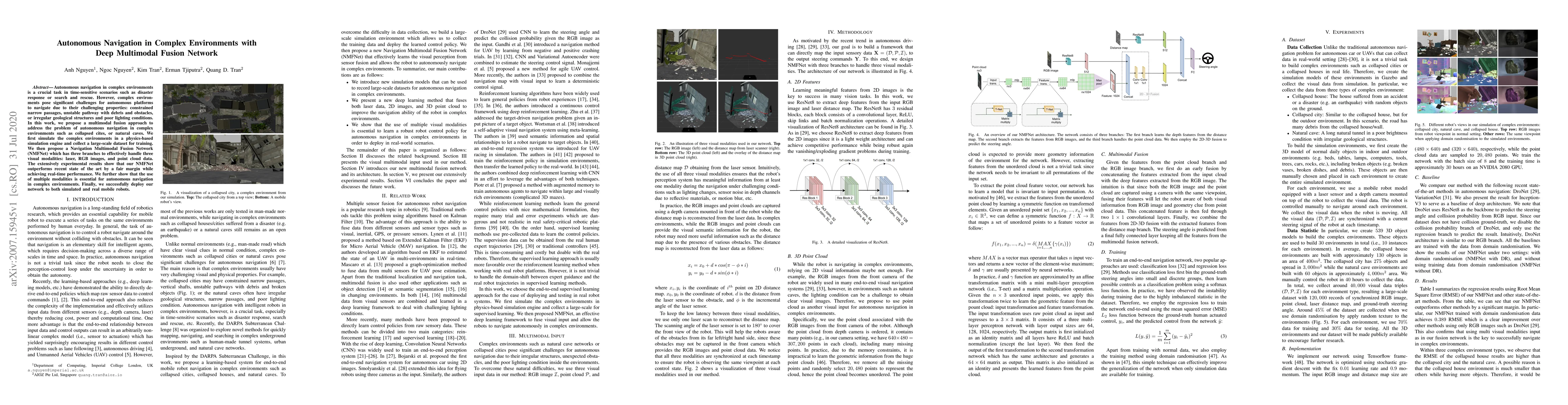 Autonomous navigation in complex environments is a crucial task in time-sensitive scenarios such as disaster response or search and rescue. However, complex environments pose significant challenges for autonomous platforms to navigate due to their challenging properties: constrained narrow passages, unstable pathway with debris and obstacles, or irregular geological structures and poor lighting conditions. In this work, we propose a multimodal fusion approach to address the problem of autonomous navigation in complex environments such as collapsed cites, or natural caves. We first simulate the complex environments in a physics-based simulation engine and collect a large-scale dataset for training. We then propose a Navigation Multimodal Fusion Network (NMFNet) which has three branches to effectively handle three visual modalities: laser, RGB images, and point cloud data. The extensively experimental results show that our NMFNet outperforms recent state of the art by a fair margin while achieving real-time performance. We further show that the use of multiple modalities is essential for autonomous navigation in complex environments. Finally, we successfully deploy our network to both simulated and real mobile robots.