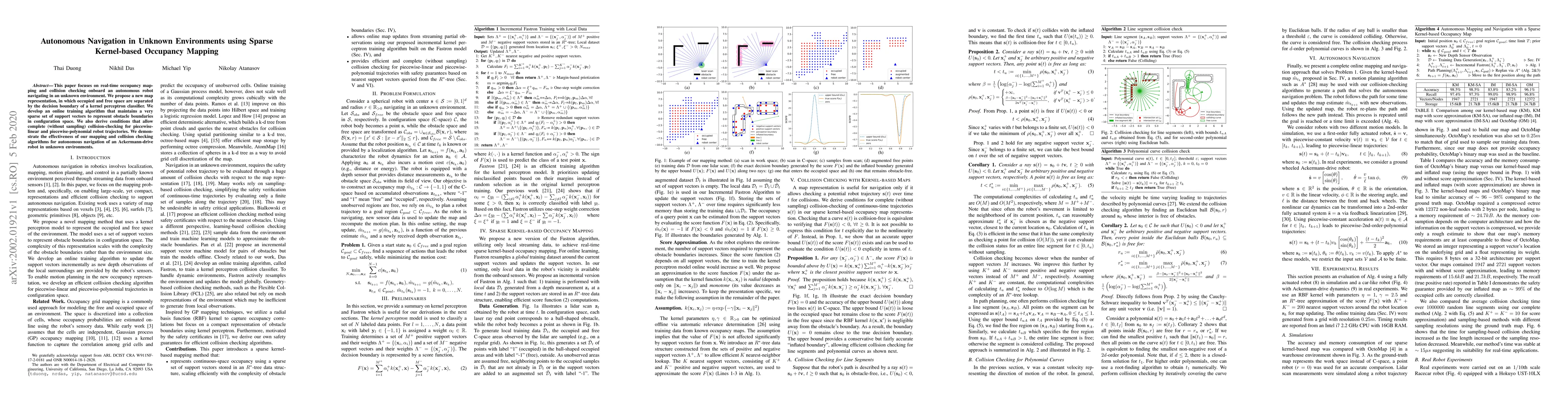 This paper focuses on real-time occupancy mapping and collision checking onboard an autonomous robot navigating in an unknown environment. We propose a new map representation, in which occupied and free space are separated by the decision boundary of a kernel perceptron classifier. We develop an online training algorithm that maintains a very sparse set of support vectors to represent obstacle boundaries in configuration space. We also derive conditions that allow complete (without sampling) collision-checking for piecewise-linear and piecewise-polynomial robot trajectories. We demonstrate the effectiveness of our mapping and collision checking algorithms for autonomous navigation of an Ackermann-drive robot in unknown environments.