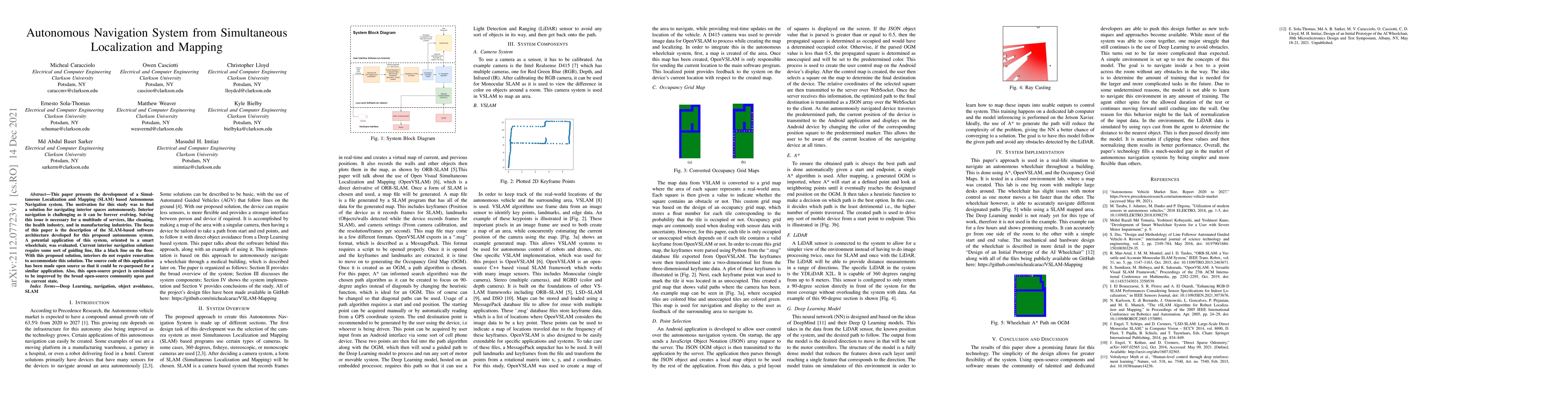This paper presents the development of a Simultaneous Localization and Mapping (SLAM) based Autonomous Navigation system. The motivation for this study was to find a solution for navigating interior spaces autonomously. Interior navigation is challenging as it can be forever evolving. Solving this issue is necessary for multitude of services, like cleaning, the health industry, and in manufacturing industries. The focus of this paper is the description of the SLAM-based software architecture developed for this proposed autonomous system. A potential application of this system, oriented to a smart wheelchair, was evaluated. Current interior navigation solutions require some sort of guiding line, like a black line on the floor. With this proposed solution, interiors do not require renovation to accommodate this solution. The source code of this application has been made open source so that it could be re-purposed for a similar application. Also, this open-source project is envisioned to be improved by the broad open-source community upon past its current state.
