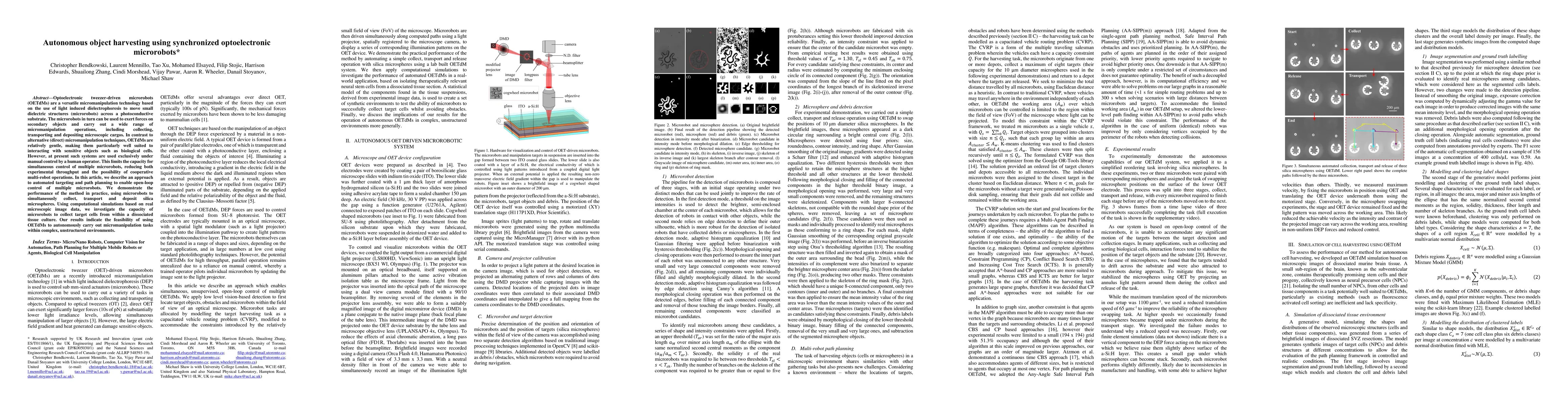 This paper presents an autonomous control system for optoelectronic tweezer-driven microrobots (OETdMs) to perform synchronized micromanipulation tasks, such as collecting and depositing silica microspheres. The method enables cooperative multi-robot operations, demonstrating the potential for these gentle microrobots to autonomously handle target cells in complex environments.