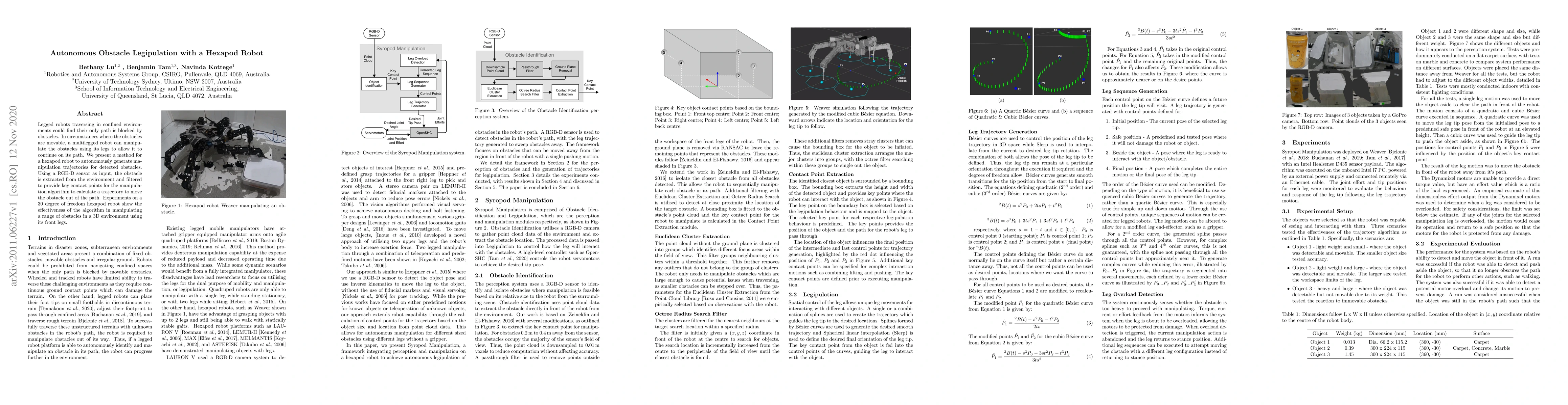 Legged robots traversing in confined environments could find their only path is blocked by obstacles. In circumstances where the obstacles are movable, a multilegged robot can manipulate the obstacles using its legs to allow it to continue on its path. We present a method for a hexapod robot to autonomously generate manipulation trajectories for detected obstacles. Using a RGB-D sensor as input, the obstacle is extracted from the environment and filtered to provide key contact points for the manipulation algorithm to calculate a trajectory to move the obstacle out of the path. Experiments on a 30 degree of freedom hexapod robot show the effectiveness of the algorithm in manipulating a range of obstacles in a 3D environment using its front legs.