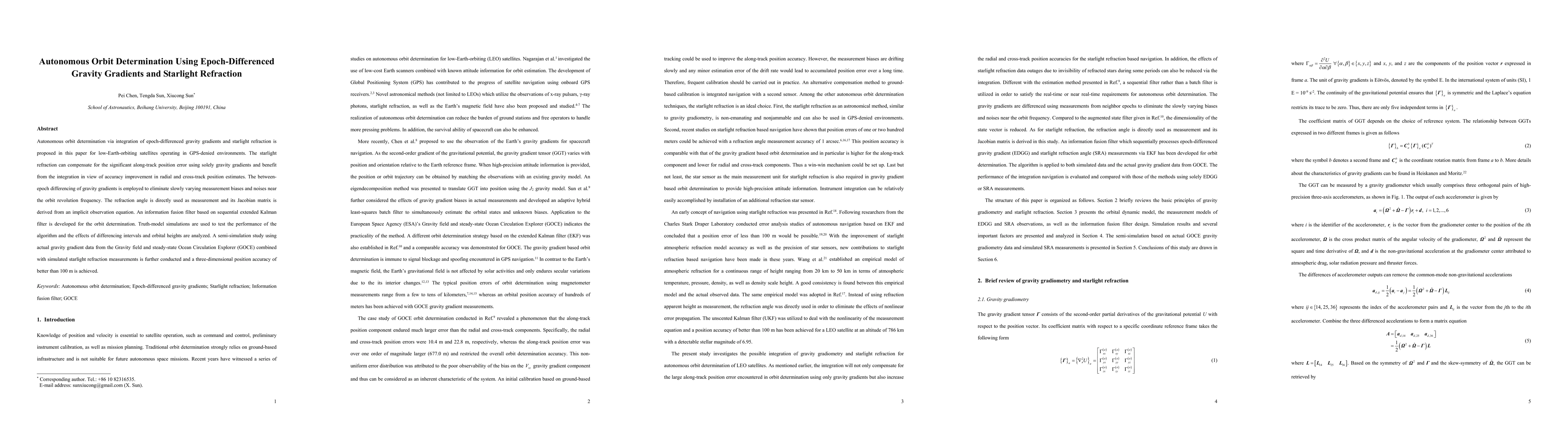 Autonomous orbit determination via integration of epoch-differenced gravity gradients and starlight refraction is proposed in this paper for low-Earth-orbiting satellites operating in GPS-denied environments. The starlight refrac-tion can compensate for the significant along-track position error using solely gravity gradients and benefit from the integration in view of accuracy improvement in radial and cross-track position estimates. The between-epoch dif-ferencing of gravity gradients is employed to eliminate slowly varying measurement biases and noises near the orbit revolution frequency. The refraction angle is directly used as measurement and its Jacobian matrix is derived from an implicit observation equation. An information fusion filter based on sequential extended Kalman filter is devel-oped for the orbit determination. Truth-model simulations are used to test the performance of the algorithm and the effects of differencing intervals and orbital heights are analyzed. A semi-simulation study using actual gravity gra-dient data from the Gravity field and steady-state Ocean Circulation Explorer (GOCE) combined with simulated starlight refraction measurements is further conducted and a three-dimensional position accuracy of better than 100 m is achieved.