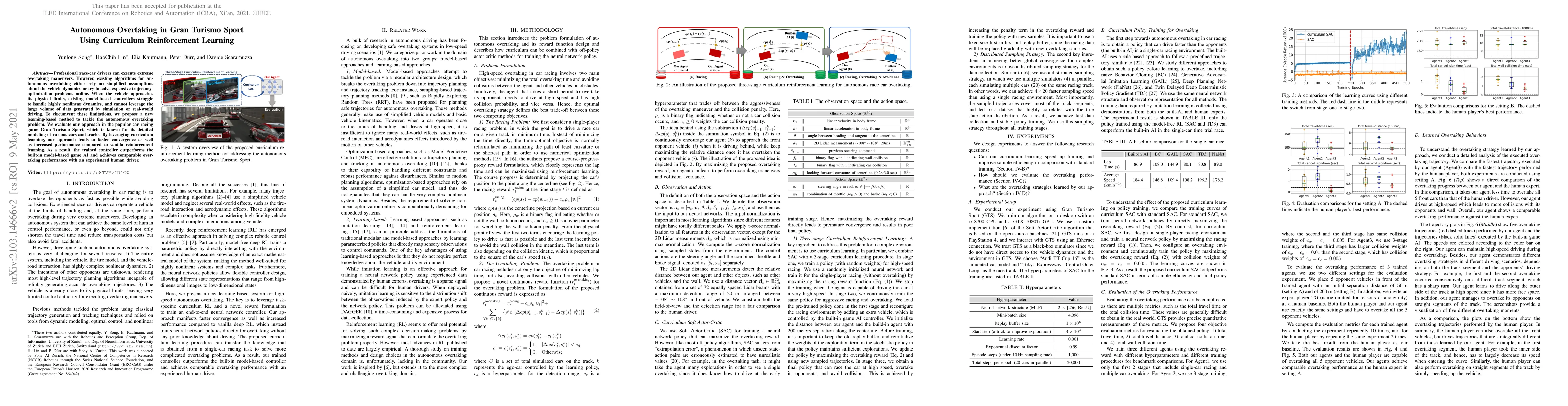 This paper proposes a curriculum reinforcement learning method for autonomous overtaking in Gran Turismo Sport, achieving faster convergence and better performance than traditional model-based controllers and vanilla reinforcement learning. The trained controller matches the overtaking skills of an experienced human driver.
